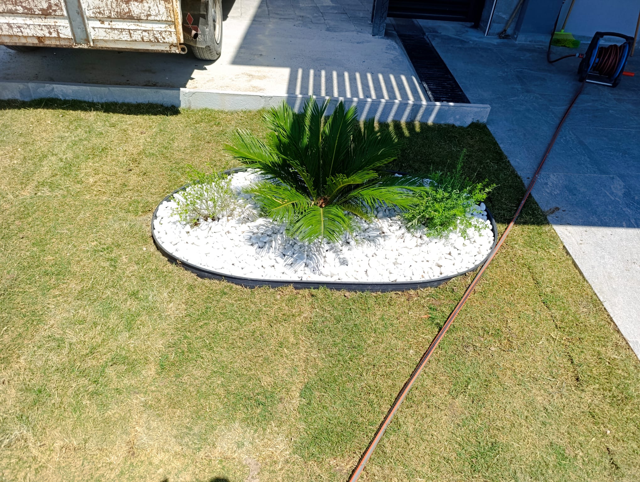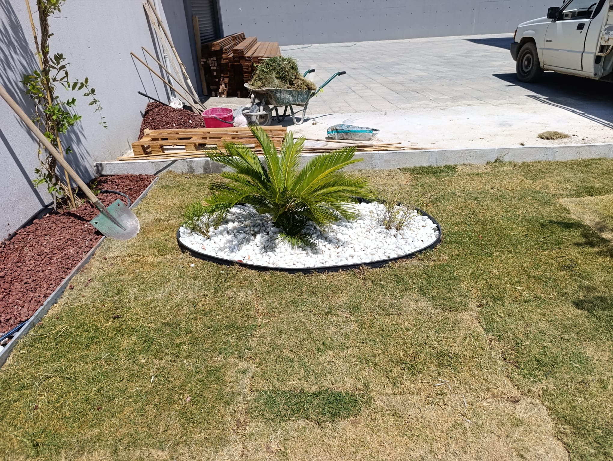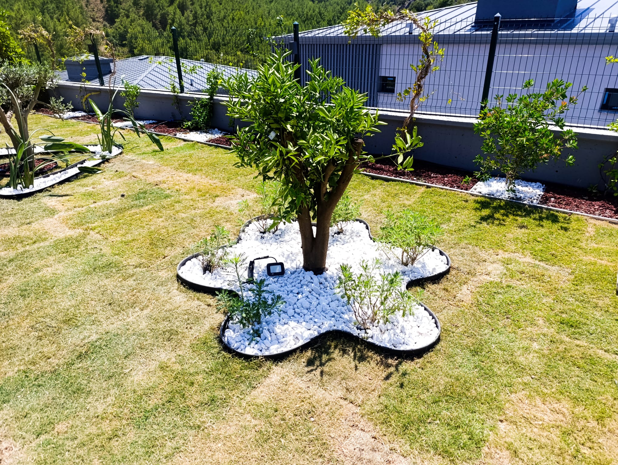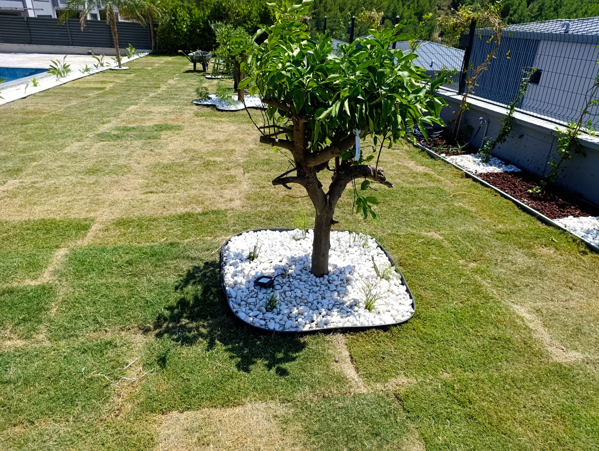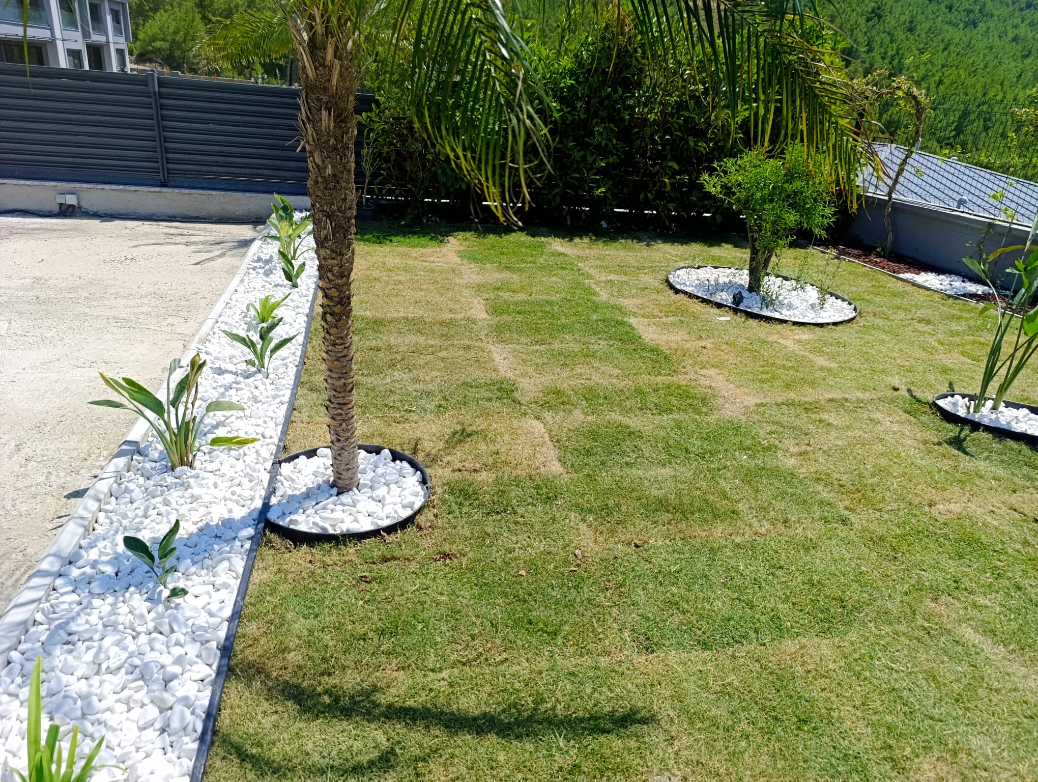 Proje kapsamında çim alanlar ve taş döşemeler de bir bütün olarak tasarlanmıştır. Rulo çim kullanılarak yeşil bir zemin oluşturulmuş, taş döşemelerle de alanlar sınırlandırılarak hem estetik hem de işlevsel bir düzenleme yapılmıştır.
