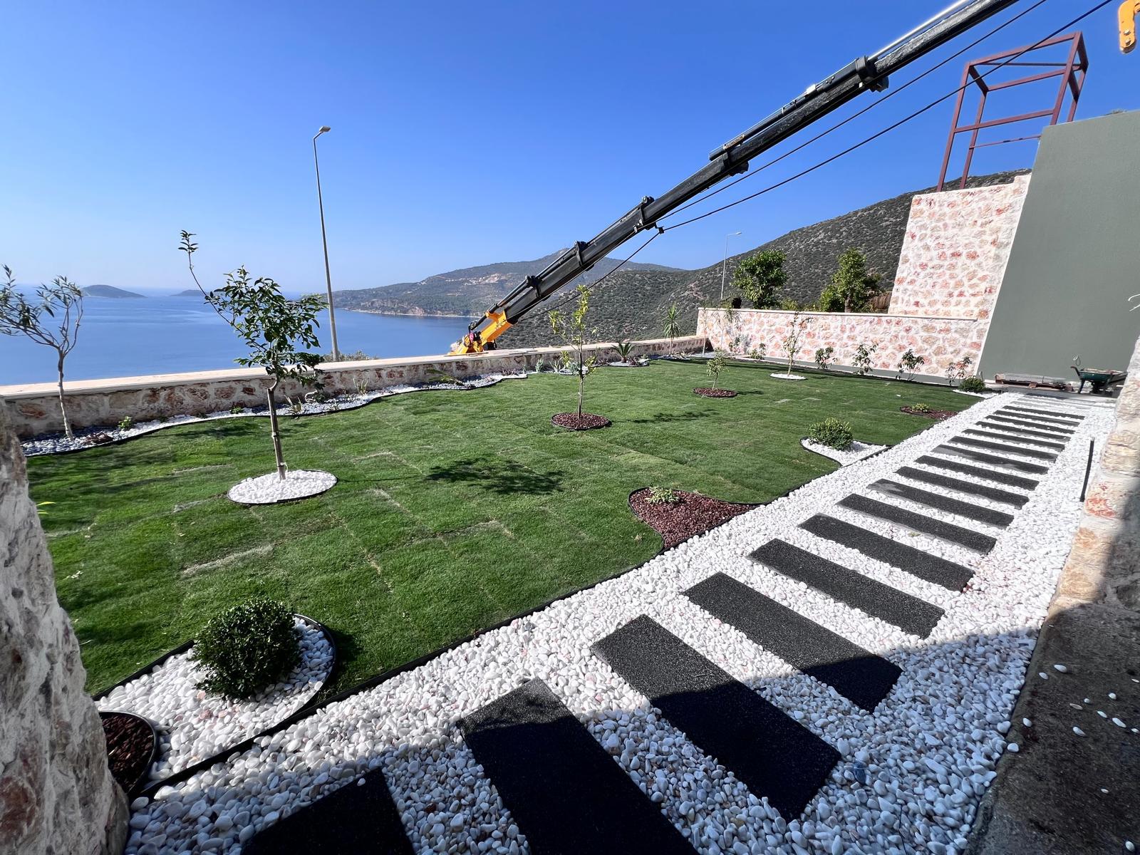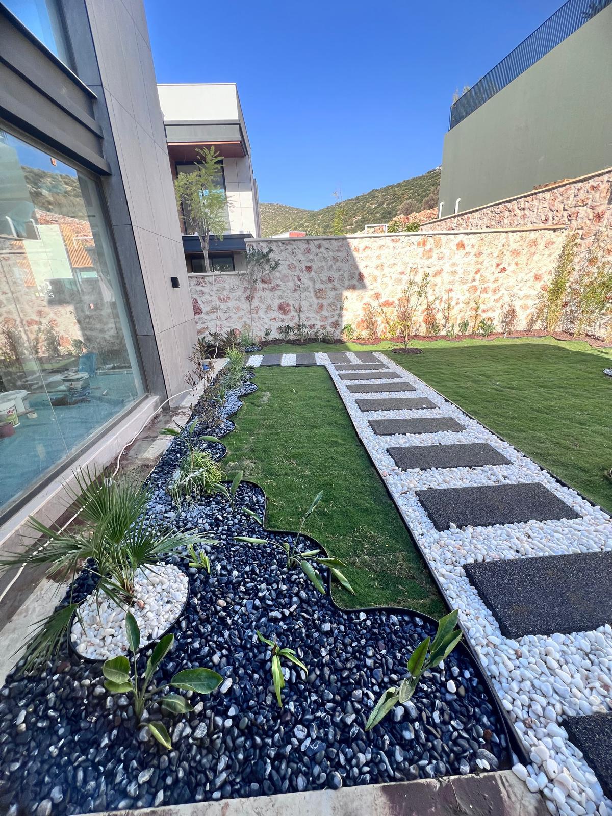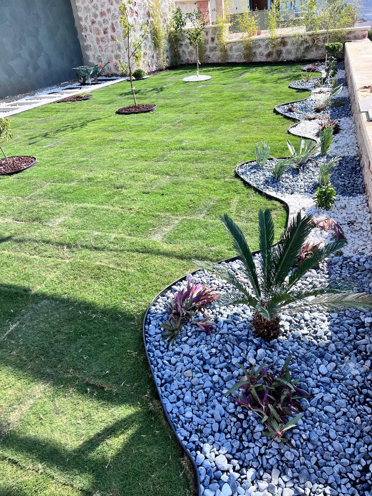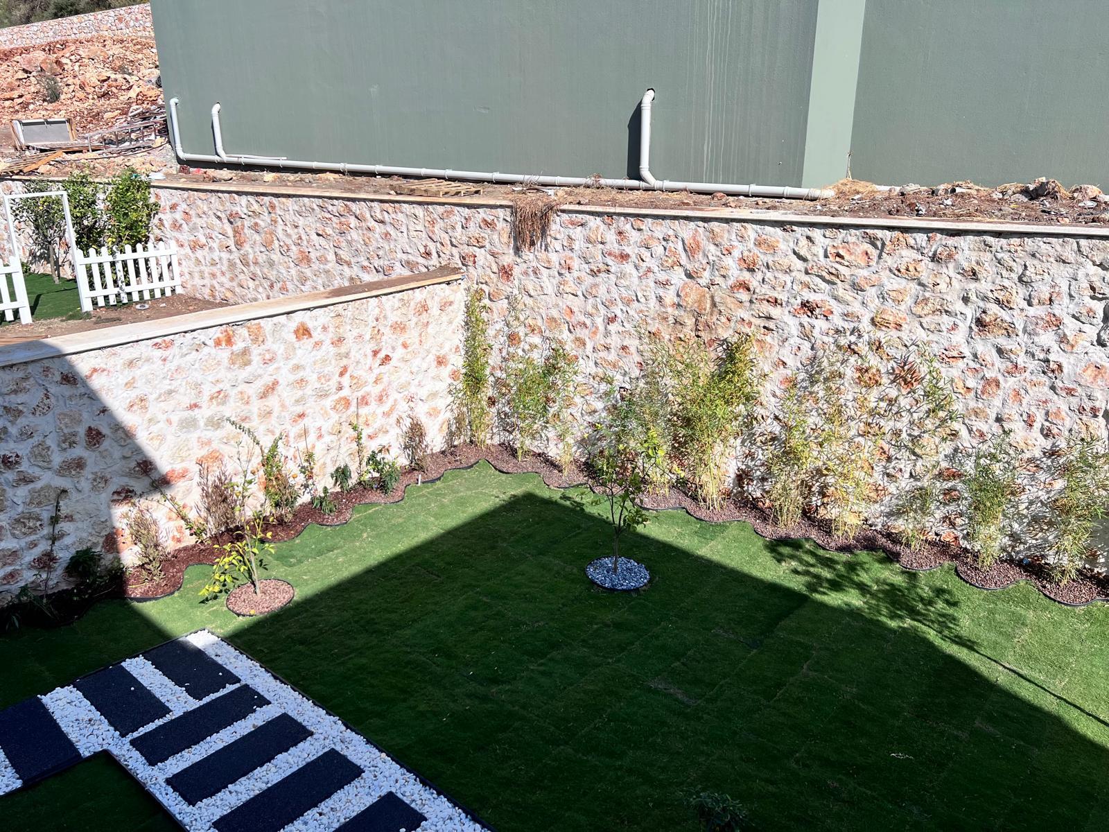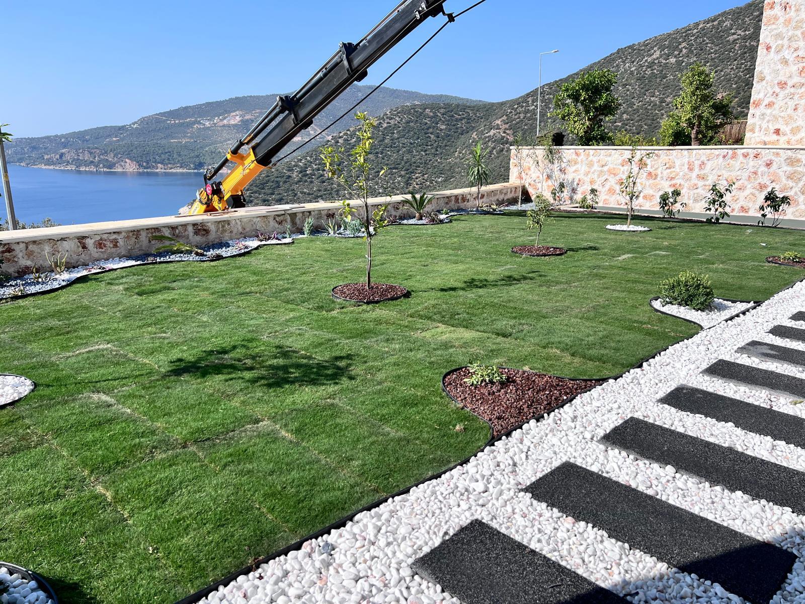Kalkandaki müşterimizin villa peyzaj süreci ilk olarak projeyle başlayıp uygulamayla devam etmiştir. Başta müşteri istekleri dinlenmiş olup bu isteklere göre tasarım oluşturulmuştur .Bitkilendirme ve rulo çim uygulaması yanında adım taşı uygulamasıda yapılmıştır. Bu villada dikkat edilmesi gereken ilk husus manzaranın kapanmamasıdır. Manzara öncelik olduğundan dolayı tasarım aşamasında çalıların kullanımı uygun görülmüştür . Müşterimiz villasını kiralayacağı için çok fazla dikenli ve zehirli bitkiler kullanılmamaya özen gösterilmiştir. Kalkanda arazi yapısından dolayı yüksek duvarlar oluştuğu için duvar görüntüsünü kırmak amaçlı bambu kullanımı tercih edilmiştir. Ara ara sarmaşık olarak arap yasemini, begonviller çalı olarak meksika petunyası ve dodonea viscosa kullanımı ile renk oluşturulmak istenmiştir.Ayrıca kapı girişlerini biraz gösterişli olması için afrika zambağı ve bodur akdeniz palmiyesi kullanılmıştır.Adım taşı uygulamasında yol oluştuktan sonra aralıklarla top şimşir kullanımı ile yol vurgulanmıştır.Aynı zamanda müşterimizin bahçesinin bir bölümünü meyve bahçesi olarak oluşturduk.En son rulo çim serimi ile bir peyzaj uygulamasını teslim etmiş olduk.