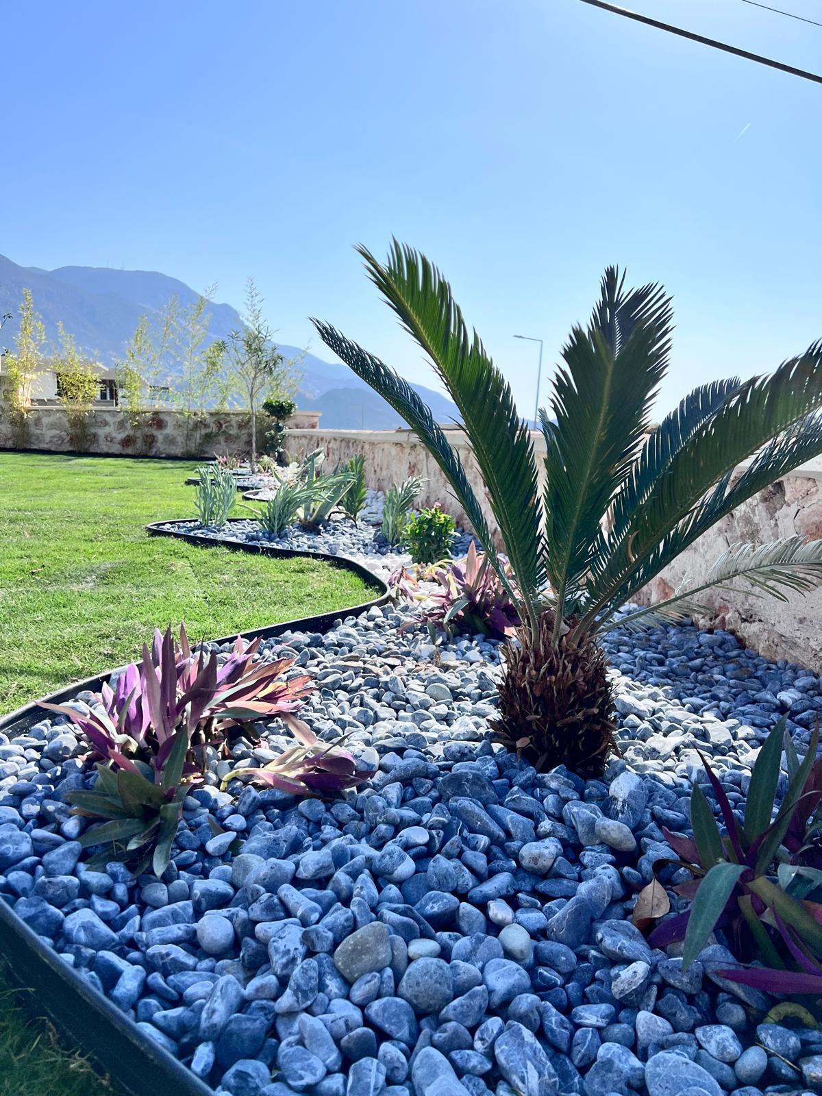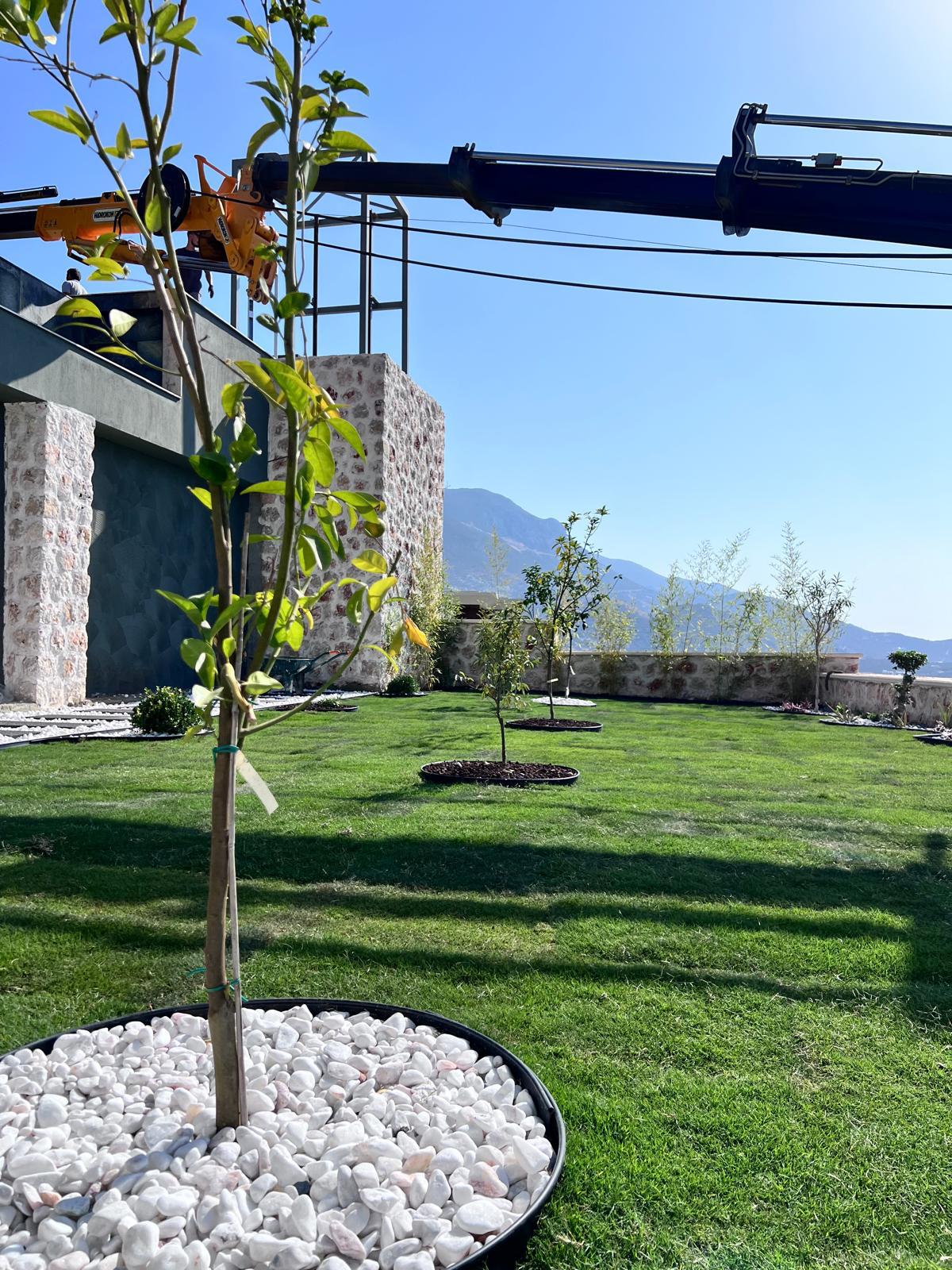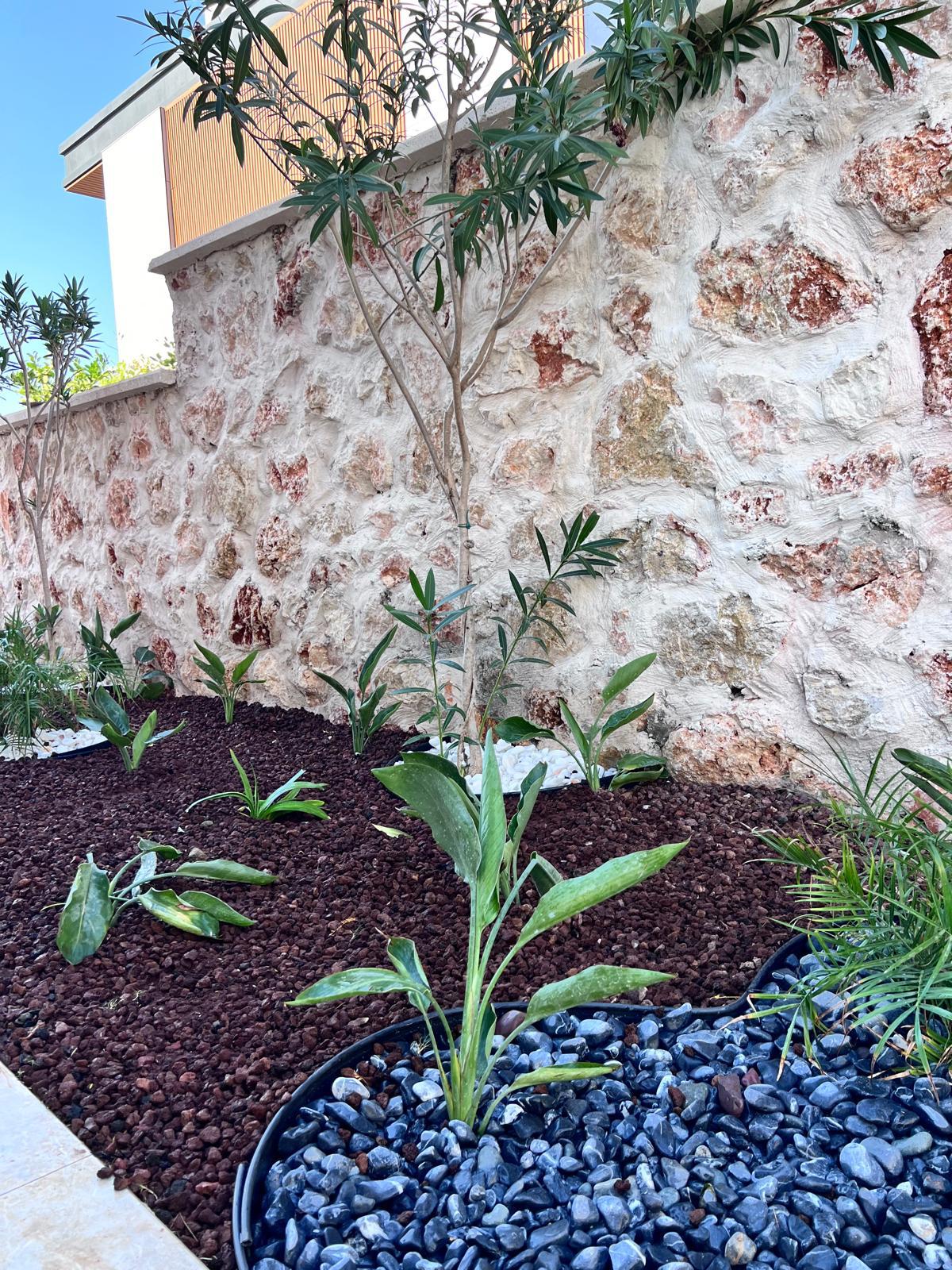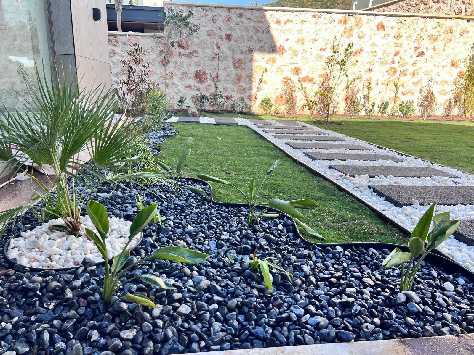 Kalkandaki müşterimizin villa peyzaj süreci ilk olarak projeyle başlayıp uygulamayla devam etmiştir. Başta müşteri istekleri dinlenmiş olup bu isteklere göre tasarım oluşturulmuştur .Bitkilendirme ve rulo çim uygulaması yanında adım taşı uygulamasıda yapılmıştır. Bu villada dikkat edilmesi gereken ilk husus manzaranın kapanmamasıdır. Manzara öncelik olduğundan dolayı tasarım aşamasında çalıların kullanımı uygun görülmüştür . Müşterimiz villasını kiralayacağı için çok fazla dikenli ve zehirli bitkiler kullanılmamaya özen gösterilmiştir. Kalkanda arazi yapısından dolayı yüksek duvarlar oluştuğu için duvar görüntüsünü kırmak amaçlı bambu kullanımı tercih edilmiştir. Ara ara sarmaşık olarak arap yasemini, begonviller çalı olarak meksika petunyası ve dodonea viscosa kullanımı ile renk oluşturulmak istenmiştir.Ayrıca kapı girişlerini biraz gösterişli olması için afrika zambağı ve bodur akdeniz palmiyesi kullanılmıştır.Adım taşı uygulamasında yol oluştuktan sonra aralıklarla top şimşir kullanımı ile yol vurgulanmıştır.Aynı zamanda müşterimizin bahçesinin bir bölümünü meyve bahçesi olarak oluşturduk.En son rulo çim serimi ile bir peyzaj uygulamasını teslim etmiş olduk.