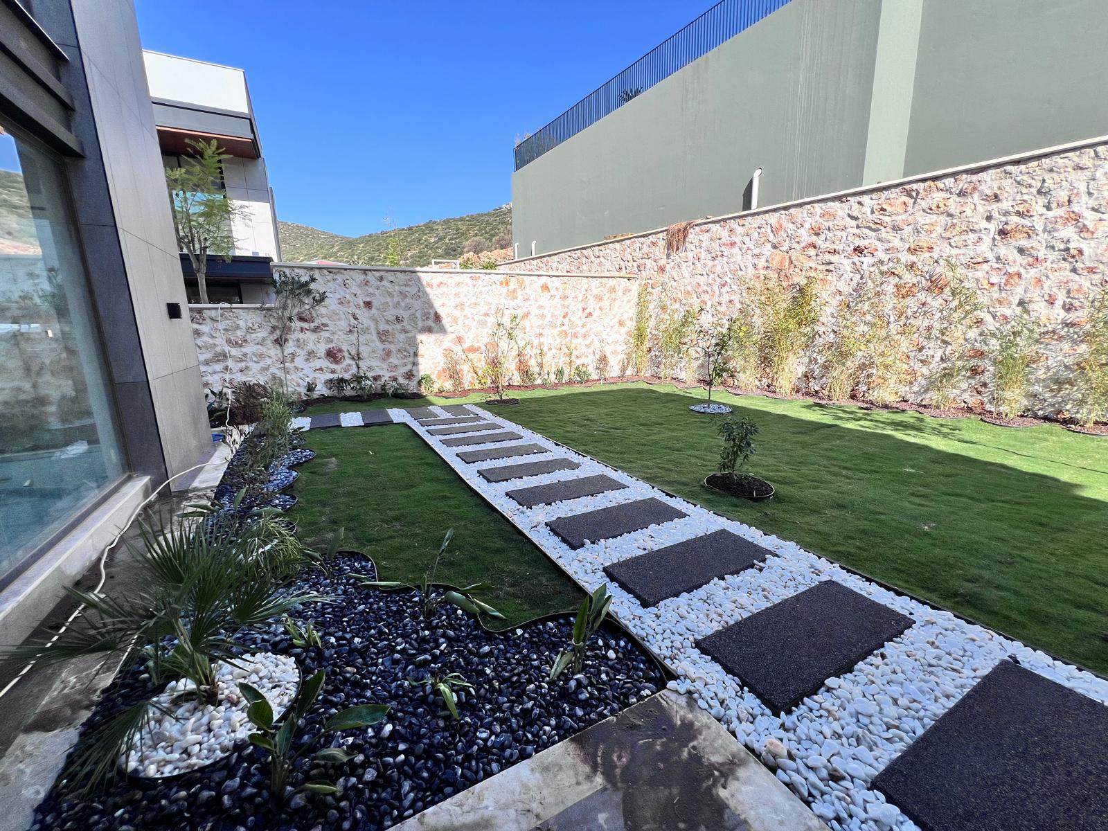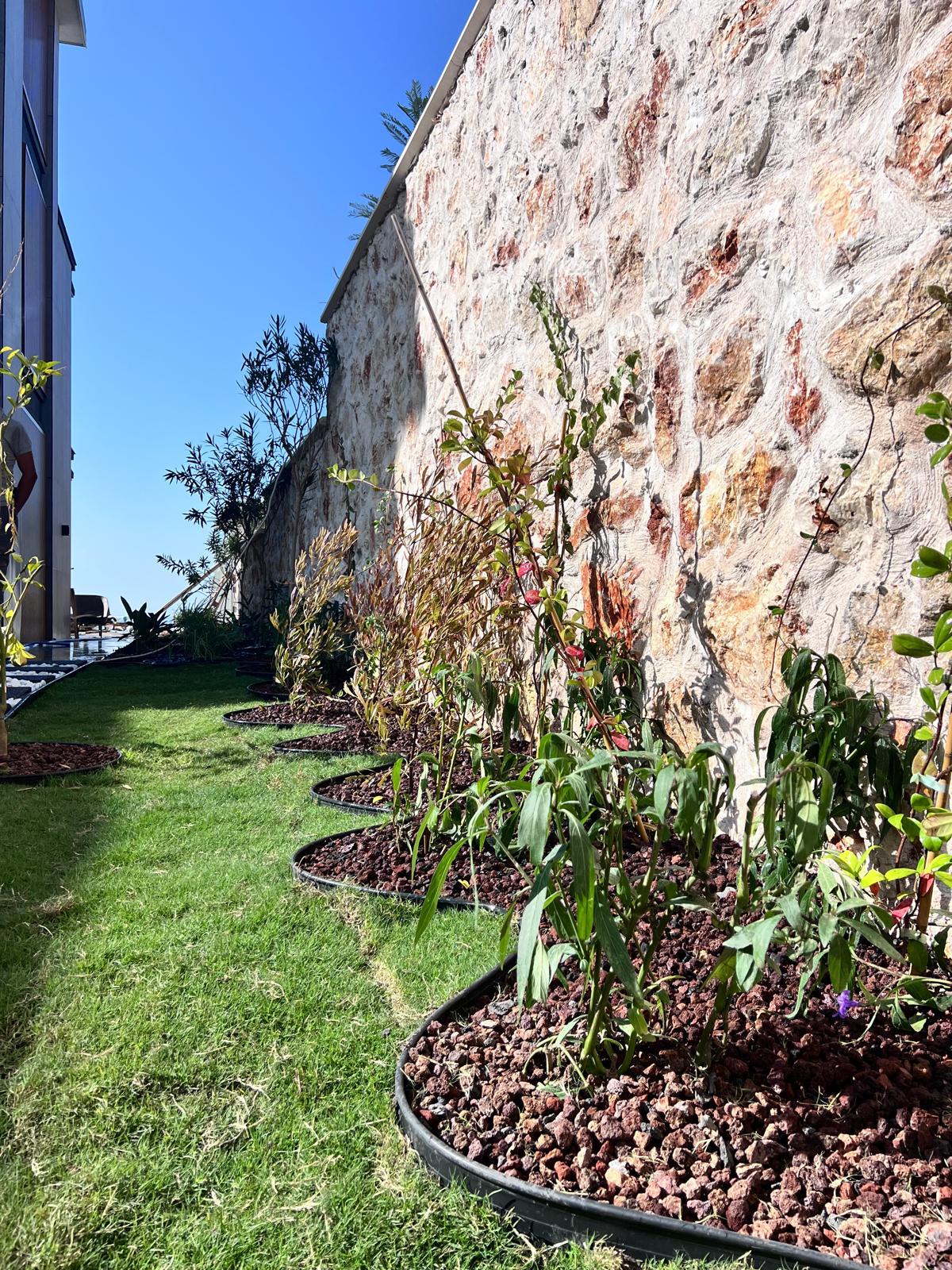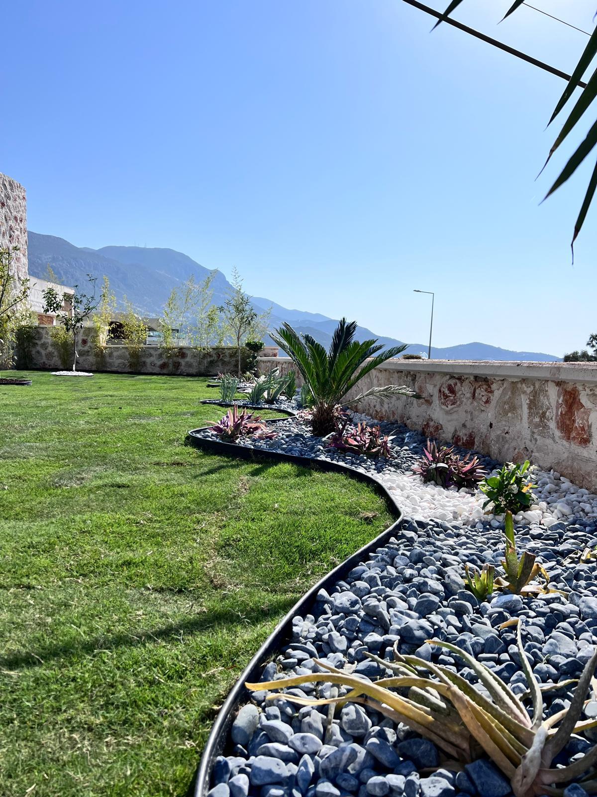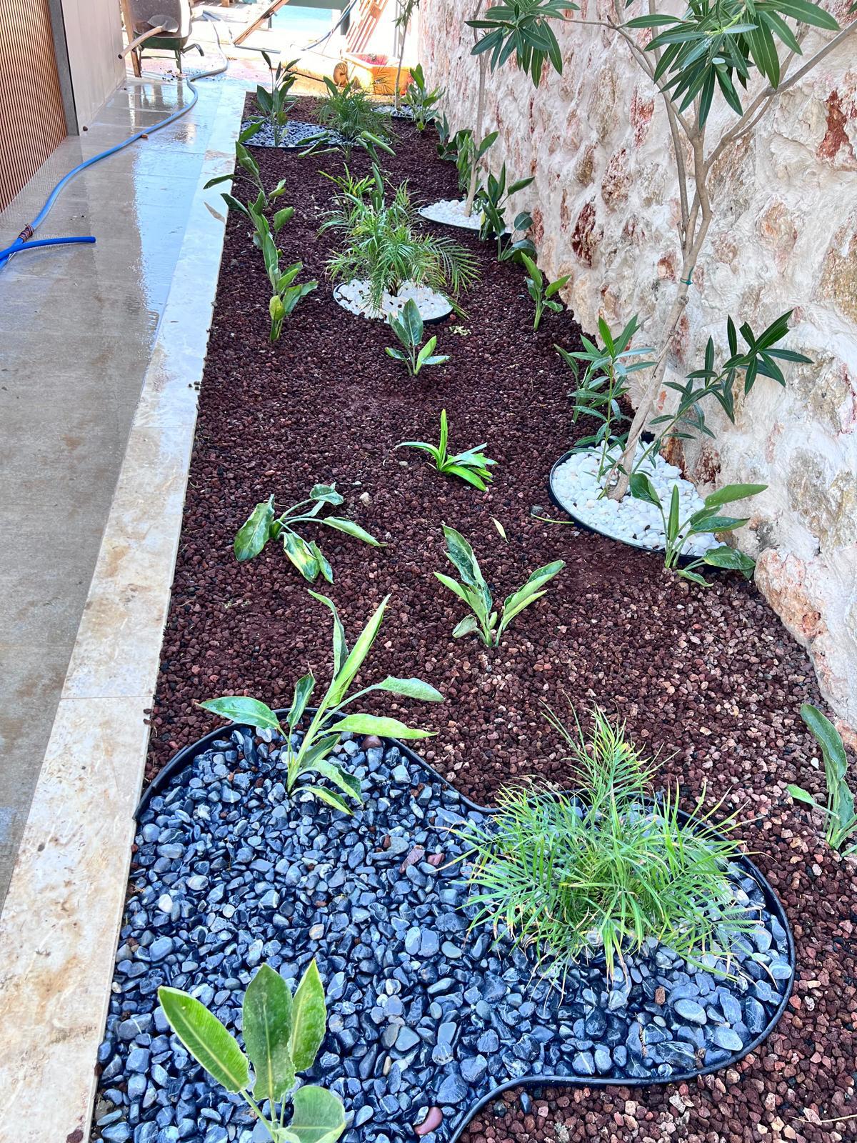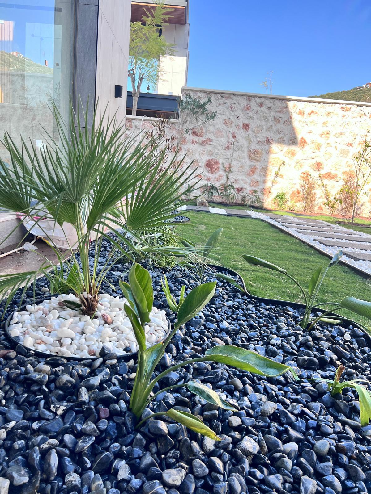 Kalkandaki müşterimizin villa peyzaj süreci ilk olarak projeyle başlayıp uygulamayla devam etmiştir. Başta müşteri istekleri dinlenmiş olup bu isteklere göre tasarım oluşturulmuştur .Bitkilendirme ve rulo çim uygulaması yanında adım taşı uygulamasıda yapılmıştır. Bu villada dikkat edilmesi gereken ilk husus manzaranın kapanmamasıdır. Manzara öncelik olduğundan dolayı tasarım aşamasında çalıların kullanımı uygun görülmüştür . Müşterimiz villasını kiralayacağı için çok fazla dikenli ve zehirli bitkiler kullanılmamaya özen gösterilmiştir. Kalkanda arazi yapısından dolayı yüksek duvarlar oluştuğu için duvar görüntüsünü kırmak amaçlı bambu kullanımı tercih edilmiştir. Ara ara sarmaşık olarak arap yasemini, begonviller çalı olarak meksika petunyası ve dodonea viscosa kullanımı ile renk oluşturulmak istenmiştir.Ayrıca kapı girişlerini biraz gösterişli olması için afrika zambağı ve bodur akdeniz palmiyesi kullanılmıştır.Adım taşı uygulamasında yol oluştuktan sonra aralıklarla top şimşir kullanımı ile yol vurgulanmıştır.Aynı zamanda müşterimizin bahçesinin bir bölümünü meyve bahçesi olarak oluşturduk.En son rulo çim serimi ile bir peyzaj uygulamasını teslim etmiş olduk.