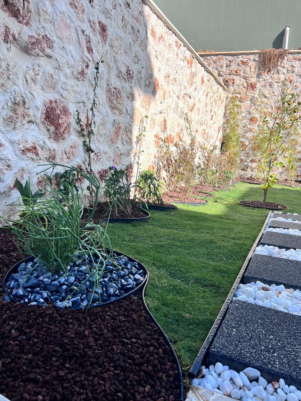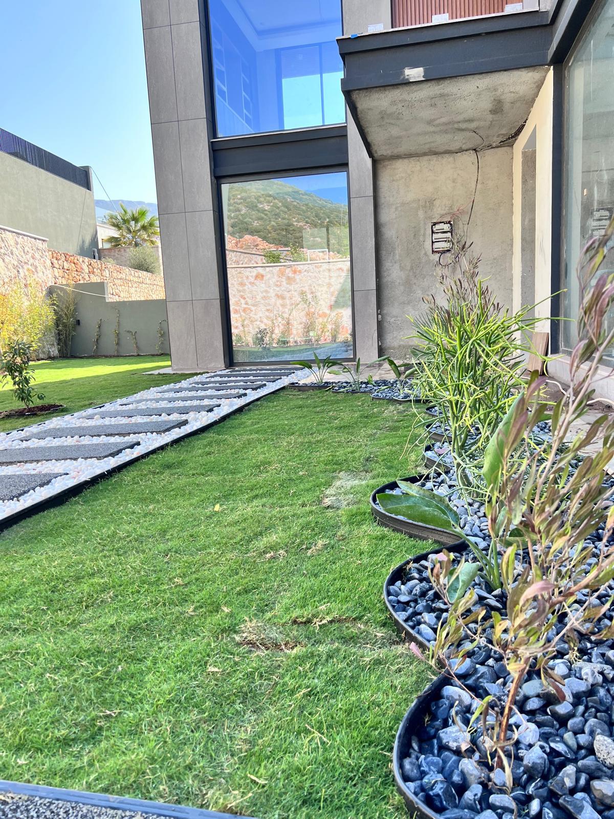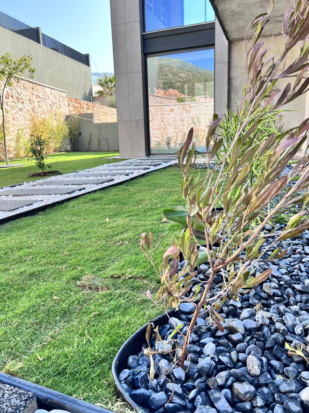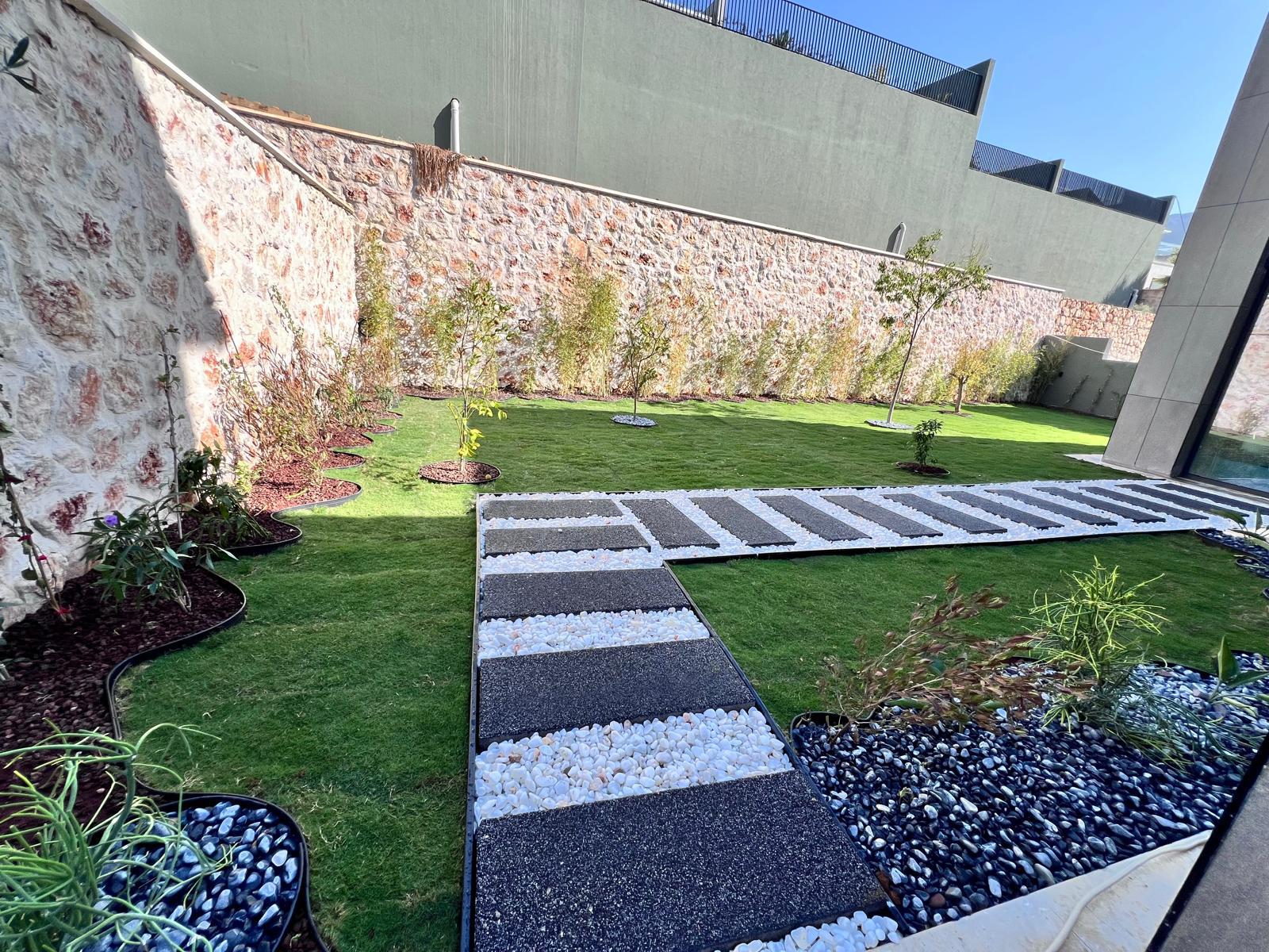 Kalkandaki müşterimizin villa peyzaj süreci ilk olarak projeyle başlayıp uygulamayla devam etmiştir. Başta müşteri istekleri dinlenmiş olup bu isteklere göre tasarım oluşturulmuştur .Bitkilendirme ve rulo çim uygulaması yanında adım taşı uygulamasıda yapılmıştır. Bu villada dikkat edilmesi gereken ilk husus manzaranın kapanmamasıdır. Manzara öncelik olduğundan dolayı tasarım aşamasında çalıların kullanımı uygun görülmüştür . Müşterimiz villasını kiralayacağı için çok fazla dikenli ve zehirli bitkiler kullanılmamaya özen gösterilmiştir. Kalkanda arazi yapısından dolayı yüksek duvarlar oluştuğu için duvar görüntüsünü kırmak amaçlı bambu kullanımı tercih edilmiştir. Ara ara sarmaşık olarak arap yasemini, begonviller çalı olarak meksika petunyası ve dodonea viscosa kullanımı ile renk oluşturulmak istenmiştir.Ayrıca kapı girişlerini biraz gösterişli olması için afrika zambağı ve bodur akdeniz palmiyesi kullanılmıştır.Adım taşı uygulamasında yol oluştuktan sonra aralıklarla top şimşir kullanımı ile yol vurgulanmıştır.Aynı zamanda müşterimizin bahçesinin bir bölümünü meyve bahçesi olarak oluşturduk.En son rulo çim serimi ile bir peyzaj uygulamasını teslim etmiş olduk.