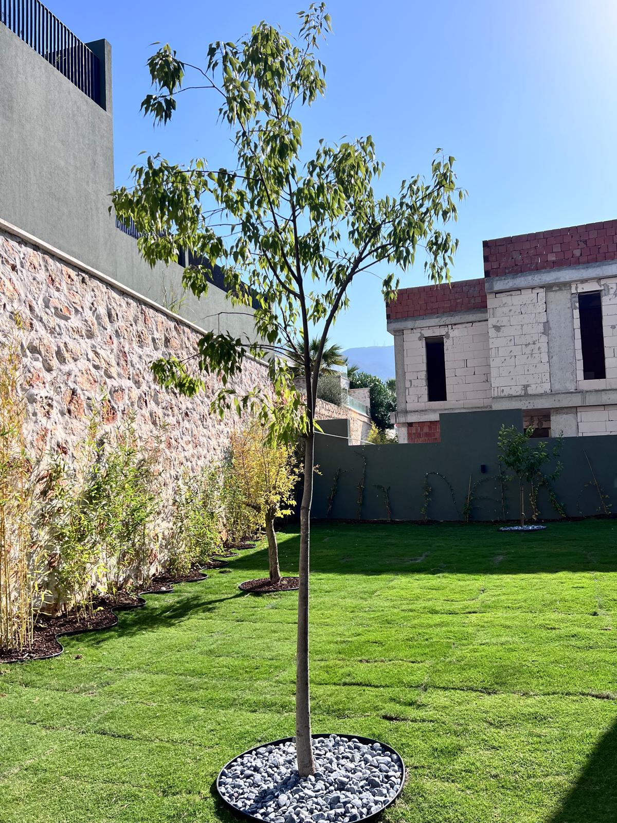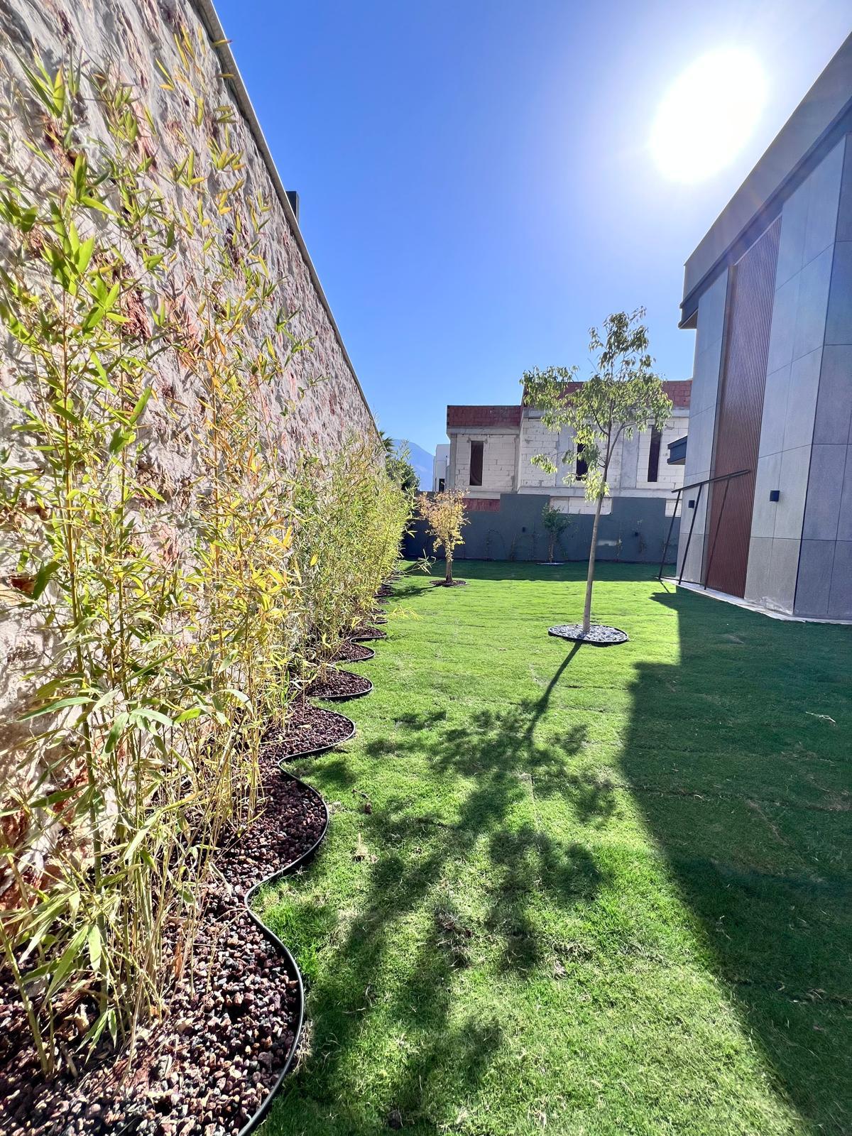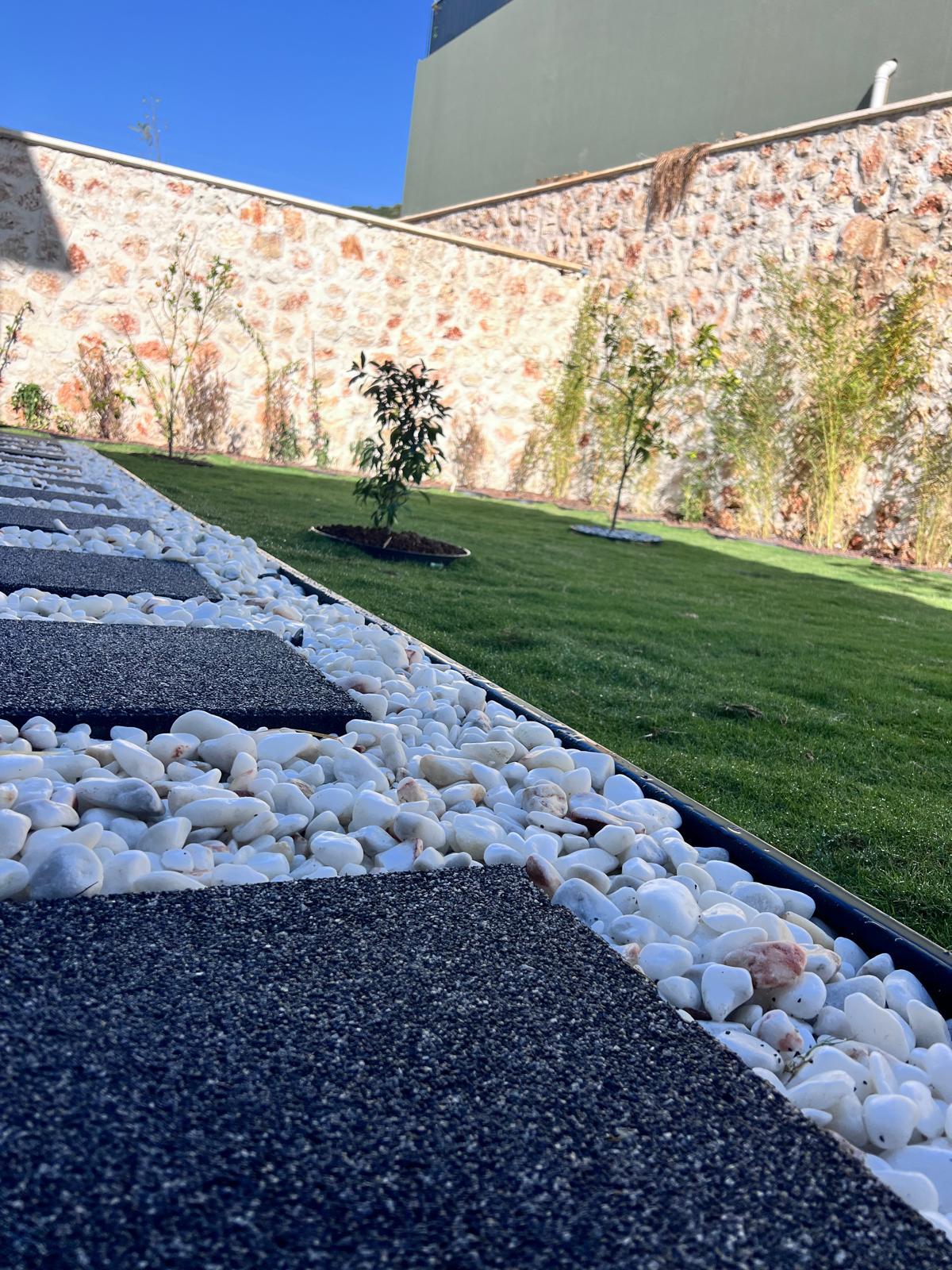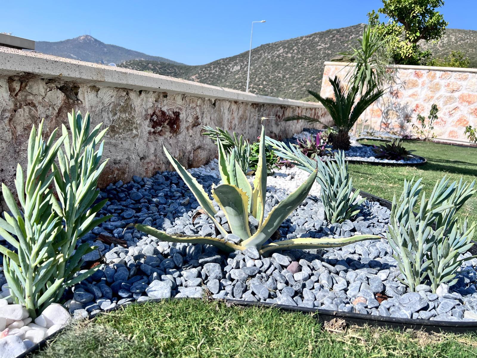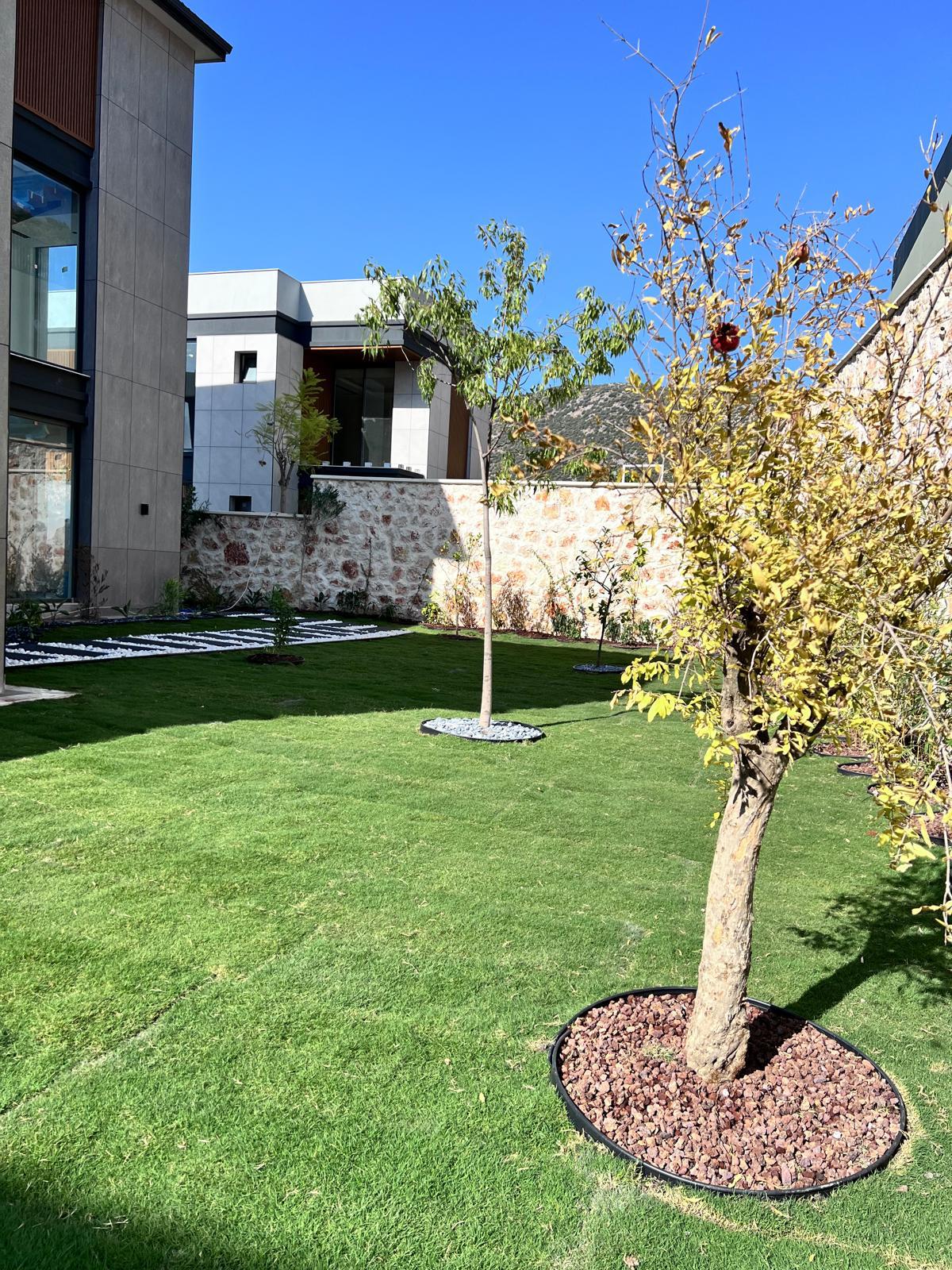 Kalkandaki müşterimizin villa peyzaj süreci ilk olarak projeyle başlayıp uygulamayla devam etmiştir. Başta müşteri istekleri dinlenmiş olup bu isteklere göre tasarım oluşturulmuştur .Bitkilendirme ve rulo çim uygulaması yanında adım taşı uygulamasıda yapılmıştır. Bu villada dikkat edilmesi gereken ilk husus manzaranın kapanmamasıdır. Manzara öncelik olduğundan dolayı tasarım aşamasında çalıların kullanımı uygun görülmüştür . Müşterimiz villasını kiralayacağı için çok fazla dikenli ve zehirli bitkiler kullanılmamaya özen gösterilmiştir. Kalkanda arazi yapısından dolayı yüksek duvarlar oluştuğu için duvar görüntüsünü kırmak amaçlı bambu kullanımı tercih edilmiştir. Ara ara sarmaşık olarak arap yasemini, begonviller çalı olarak meksika petunyası ve dodonea viscosa kullanımı ile renk oluşturulmak istenmiştir.Ayrıca kapı girişlerini biraz gösterişli olması için afrika zambağı ve bodur akdeniz palmiyesi kullanılmıştır.Adım taşı uygulamasında yol oluştuktan sonra aralıklarla top şimşir kullanımı ile yol vurgulanmıştır.Aynı zamanda müşterimizin bahçesinin bir bölümünü meyve bahçesi olarak oluşturduk.En son rulo çim serimi ile bir peyzaj uygulamasını teslim etmiş olduk.