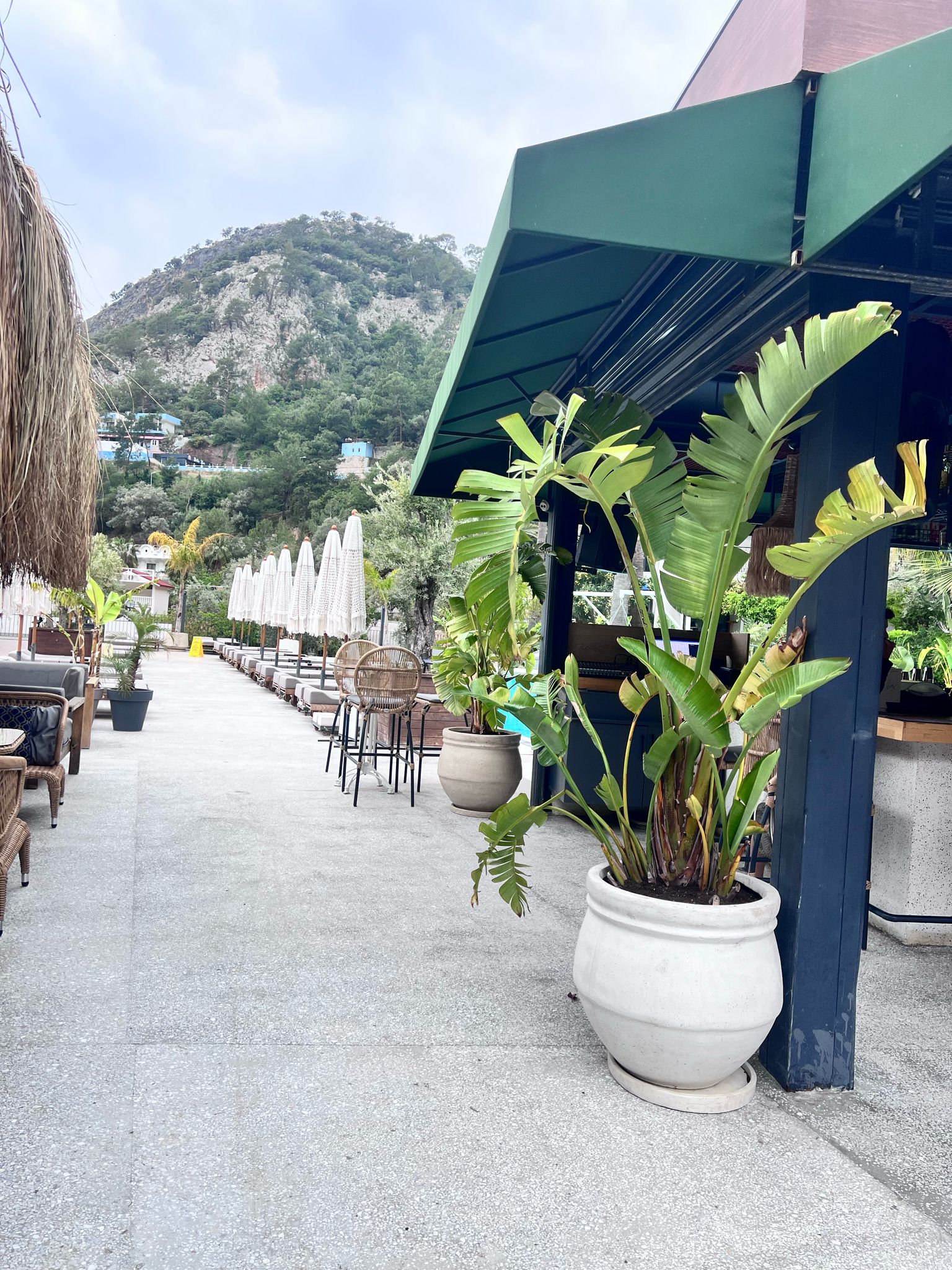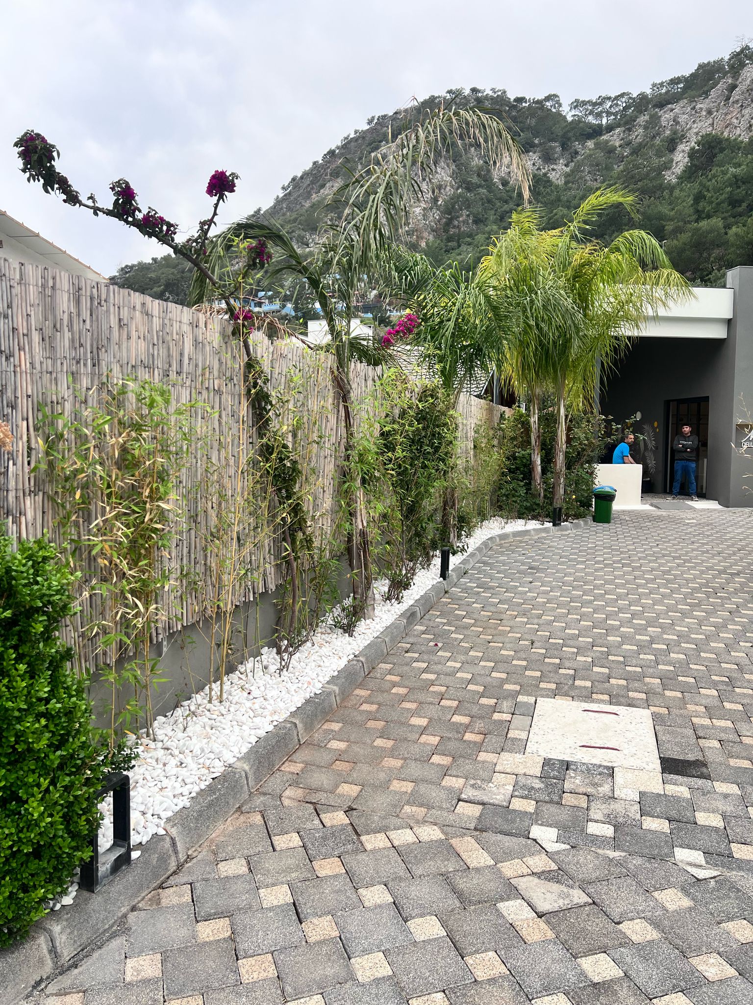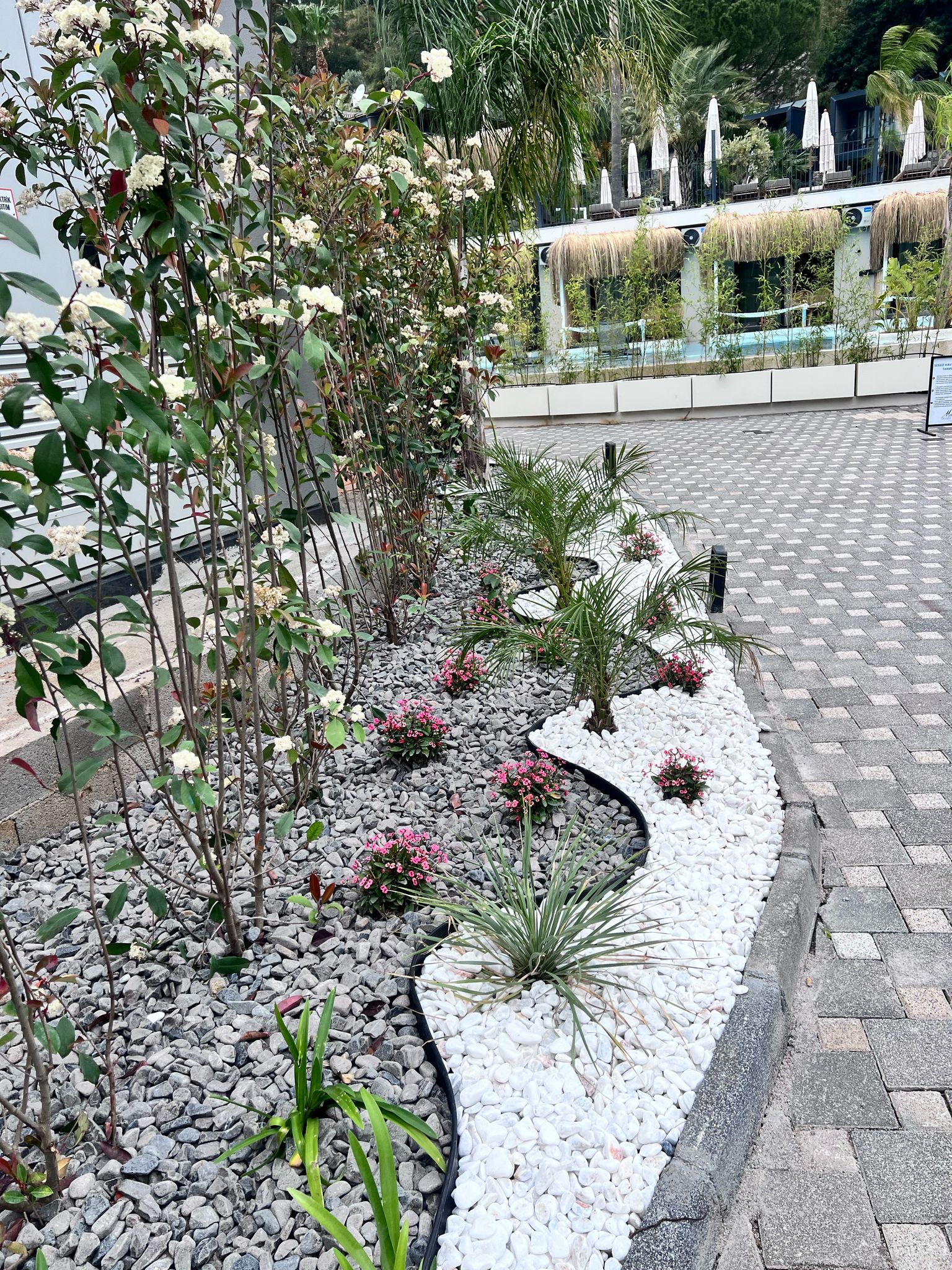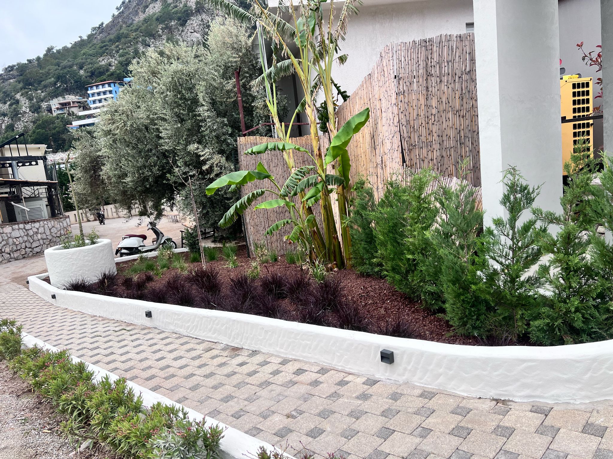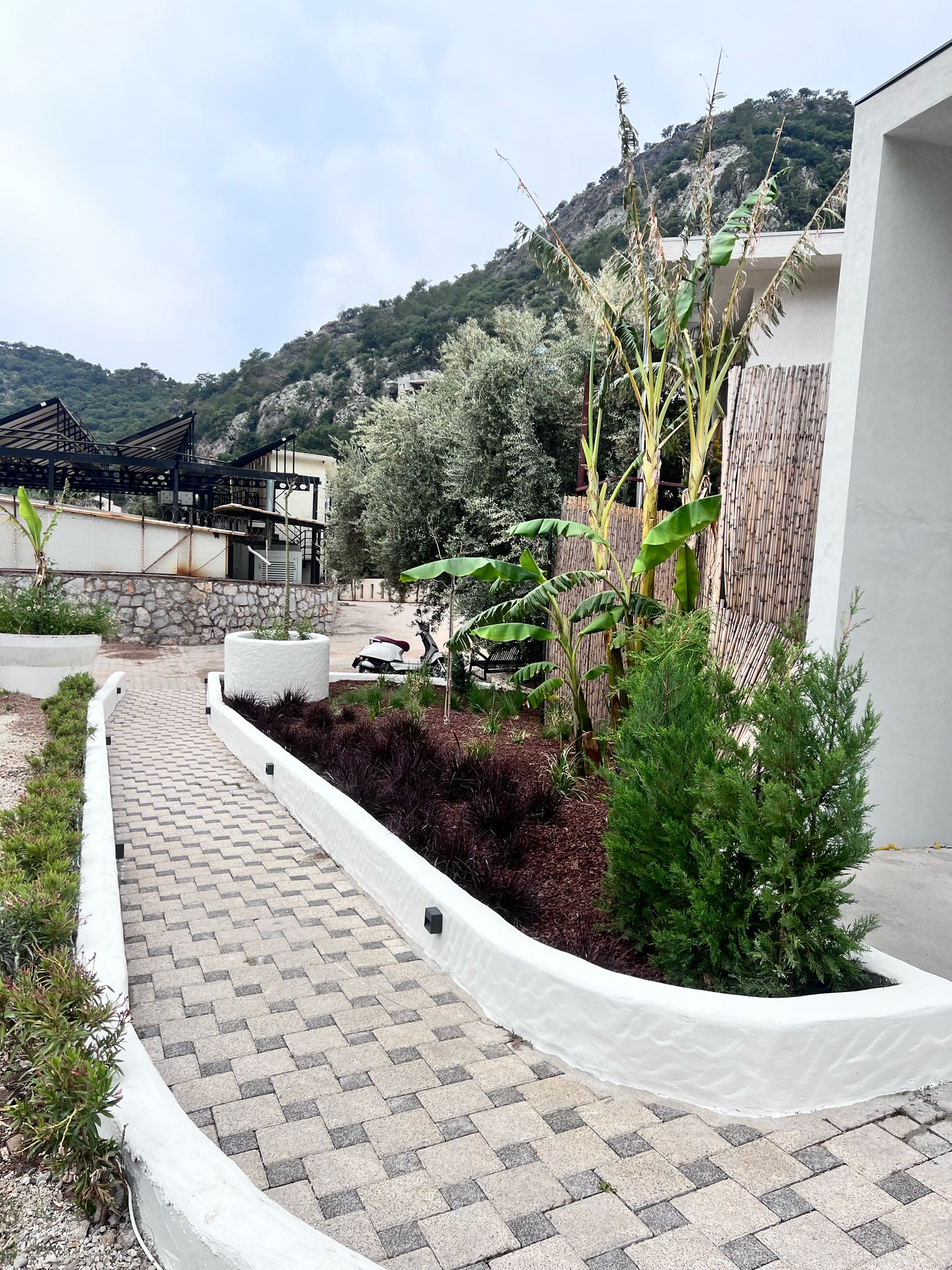 Fethiyede yer alan bu otel projesinde tasarım süreci tamamen müşterinin istek ve beklentileri doğrultusunda şekillendirilmiştir. Projenin her aşaması, müşteriyle yakın iş birliği içerisinde yürütülmüş; çizim ve bitkisel düzenleme adımları titizlikle planlanarak başarıyla tamamlanmıştır.Proje kapsamında dış mekanlarda taş döşeme uygulamaları gerçekleştirilmiş, bu uygulamalar görsel bütünlüğün yanı sıra alanın işlevselliğini de artıracak şekilde kurgulanmıştır. Kullanılan taş malzemeler, doğayla uyumlu dokular ve renklerle seçilerek otelin genel mimarisiyle estetik bir uyum içinde sunulmuştur.Alan düzenlemesi yapılırken, seçilen bitki türleri ve malzemeler doğal kullanım alışkanlıklarına uygun olacak şekilde belirlenmiş; böylece hem estetik hem de fonksiyonel açıdan dengeli ve sürdürülebilir bir peyzaj elde edilmiştir. Alanın doğal yapısını koruyan, aynı zamanda konfor ve kullanım kolaylığı sağlayan bu çözümler, otel misafirleri için davetkâr ve huzurlu bir ortam yaratmıştır. Proje boyunca kullanılan yüksek kaliteli malzemeler, dikkatli planlama ve uygulamadaki özen, her aşamada müşteri memnuniyetini üst düzeyde tutmuştur. Sonuç olarak, doğayla uyumlu, şık ve işlevsel bir dış mekan yaşam alanı başarıyla oluşturulmuştur.