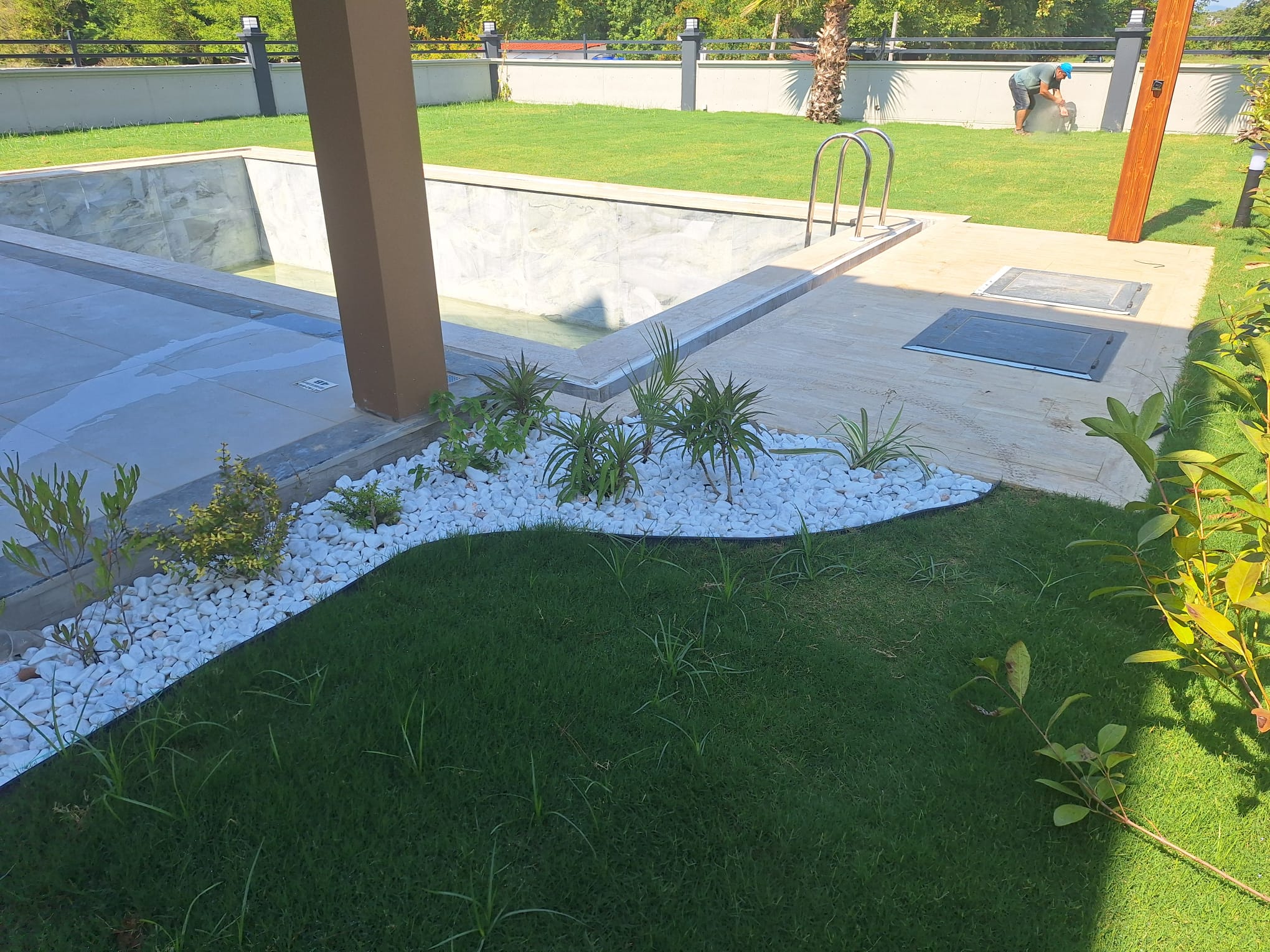 Bu projede, proje çizimi ve bitkisel uygulama özenle gerçekleştirilmiş, ardından taş uygulaması devam etmiştir. Proje kapsamında, site içerisindeki 8 villa bahçesi -2250 m2- alanda toprak tesviye işlemi gerçekleştirilmiş ve ardından rulo çim uygulaması yapılmıştır.