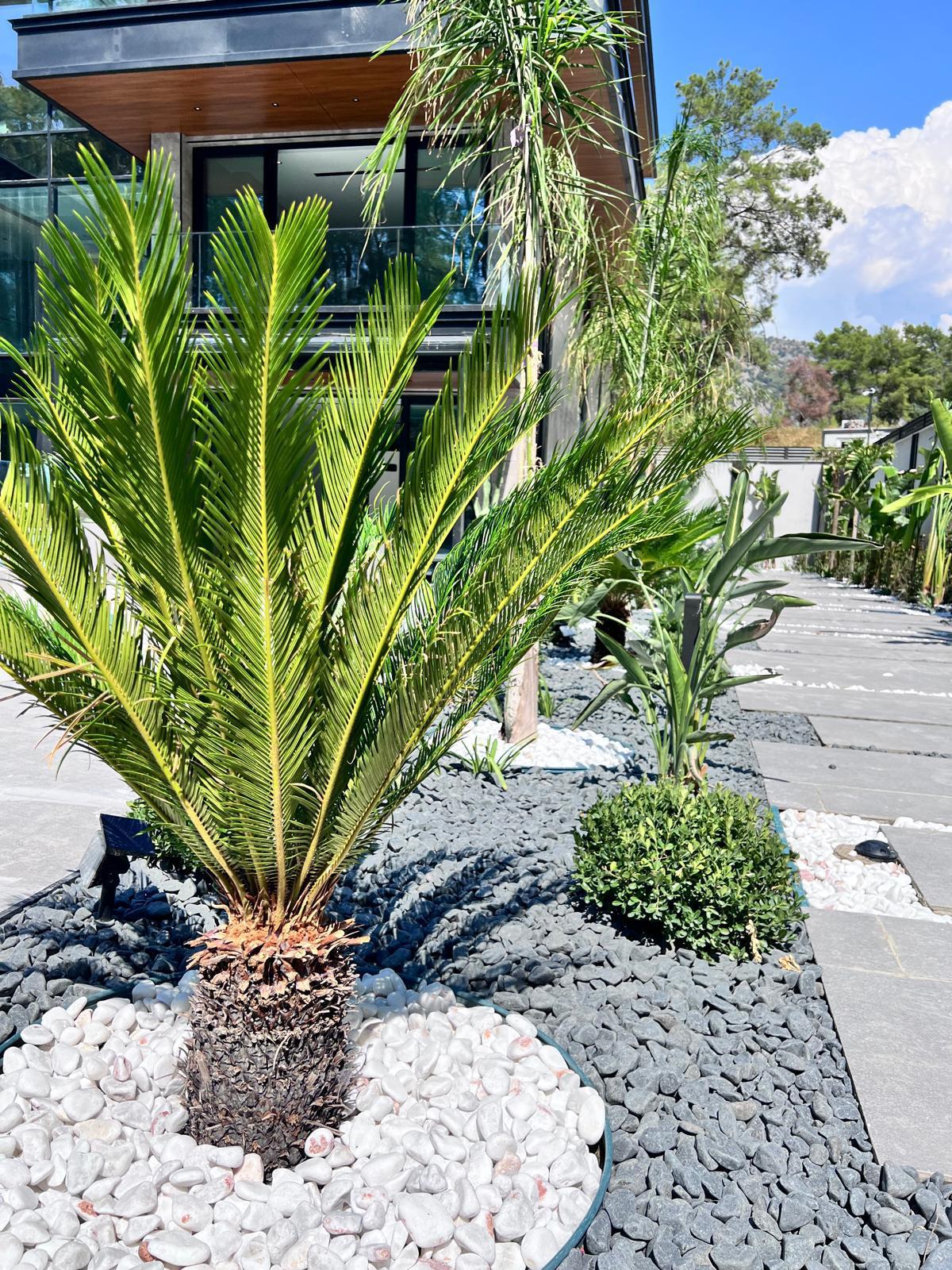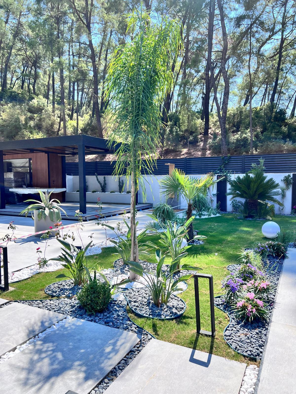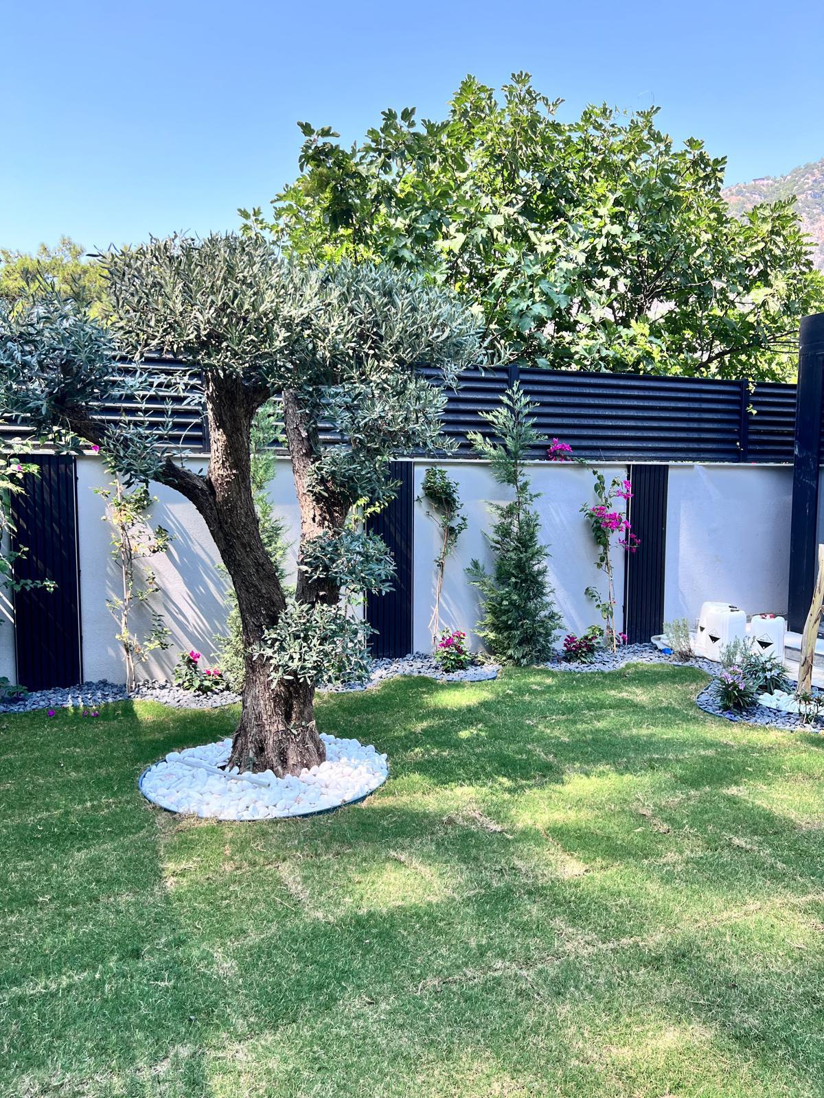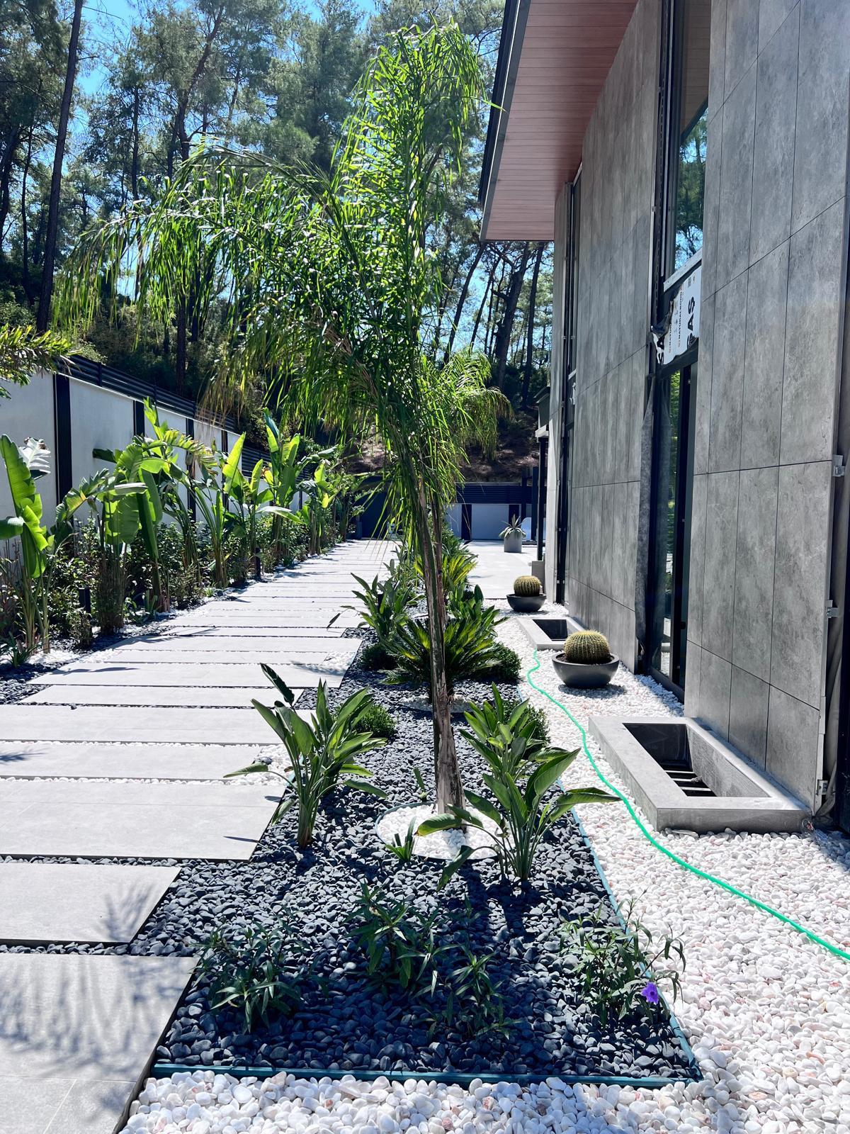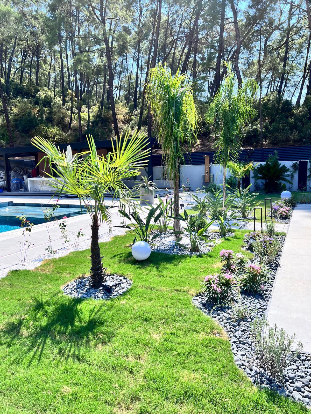 Göcek’in en güzel köşelerinden birinde yer alan bu villa, özenle hazırlanmış bir proje çizimi ile hayat bulmuş ve ardından uygulama aşamasına geçilmiştir. Tasarımda tropikal bitkiler ön planda tutulmuş; dev cennet kuşu çiçeği, ficus bonsai, zeytin bonsai, kraliçe palmiyesi, sicas, cüce hurma, tilki kuyruğu palmiyesi, altınfıçı kaktüsü ve kaya kaktüsü gibi zengin bir bitki çeşitliliği kullanılmıştır. Bahçenin bir kısmı görsel bir cennet olarak tasarlanırken, diğer bölümü meyve bahçesi olarak düzenlenmiştir. Havuz başındaki saksı bitkileri, bu alanı daha da zenginleştirmiştir. Meyve bahçesinin yanında, yemyeşil bir çim alan oluşturulmuş, pomza, bazalt ve dolamit taşları ile estetik bir düzenleme sağlanmıştır. En son olarak, rulo çim serimi ile hayal edilen bahçe tamamlanmış ve müşteriye teslim edilmiştir. Bu proje, doğayla iç içe huzurlu bir yaşam alanı sunmaktadır.