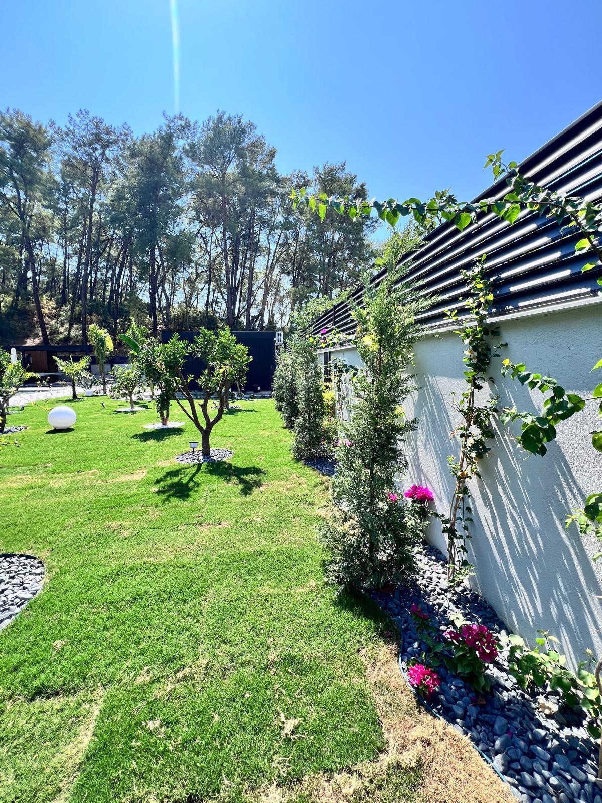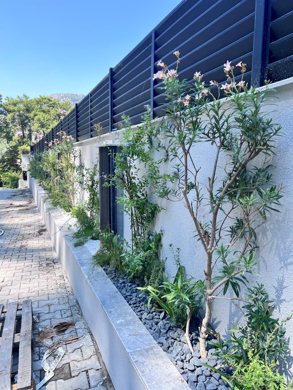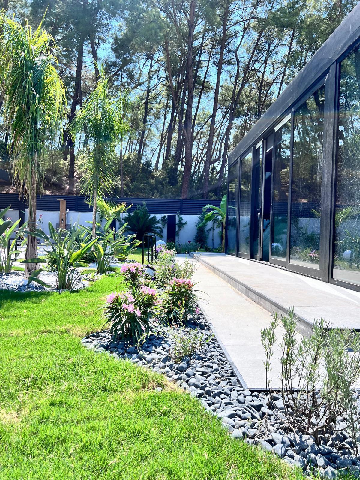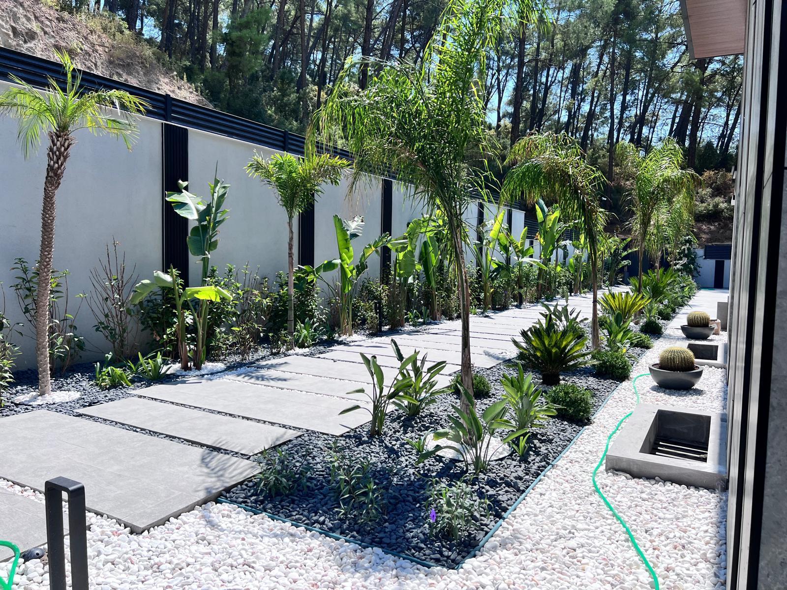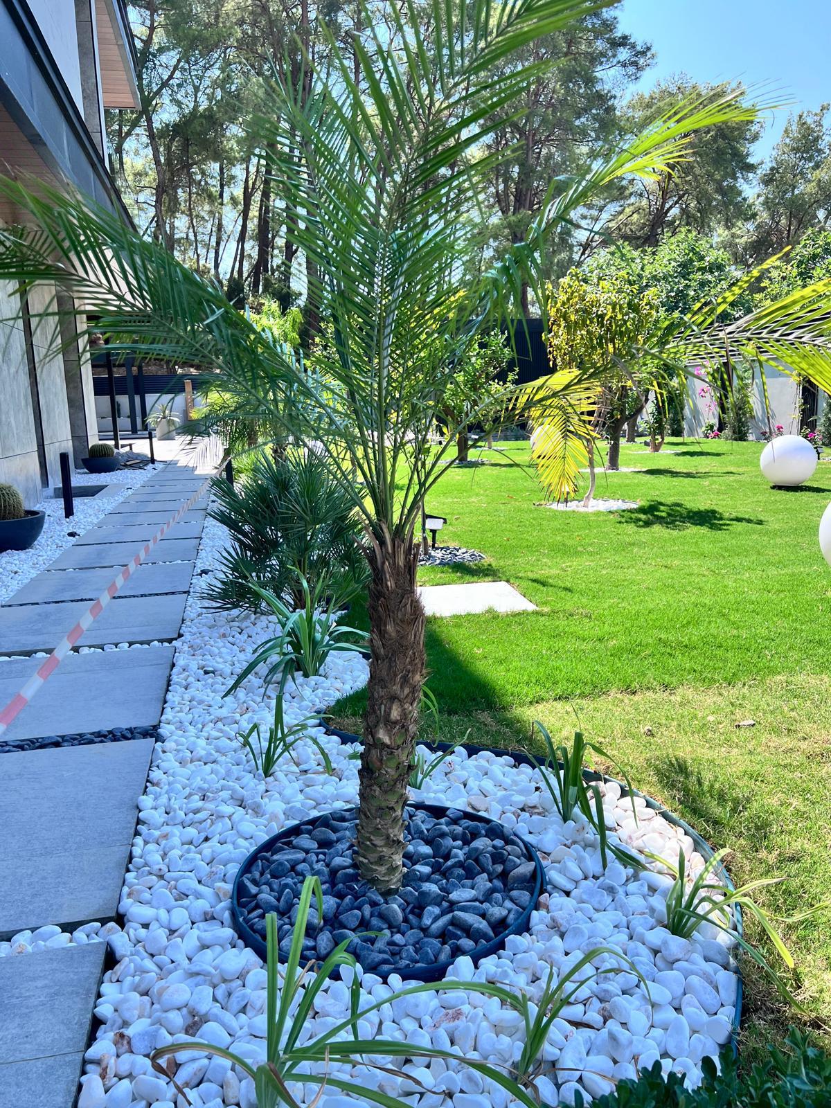 Göcek’in en güzel köşelerinden birinde yer alan bu villa, özenle hazırlanmış bir proje çizimi ile hayat bulmuş ve ardından uygulama aşamasına geçilmiştir. Tasarımda tropikal bitkiler ön planda tutulmuş; dev cennet kuşu çiçeği, ficus bonsai, zeytin bonsai, kraliçe palmiyesi, sicas, cüce hurma, tilki kuyruğu palmiyesi, altınfıçı kaktüsü ve kaya kaktüsü gibi zengin bir bitki çeşitliliği kullanılmıştır. Bahçenin bir kısmı görsel bir cennet olarak tasarlanırken, diğer bölümü meyve bahçesi olarak düzenlenmiştir. Havuz başındaki saksı bitkileri, bu alanı daha da zenginleştirmiştir. Meyve bahçesinin yanında, yemyeşil bir çim alan oluşturulmuş, pomza, bazalt ve dolamit taşları ile estetik bir düzenleme sağlanmıştır. En son olarak, rulo çim serimi ile hayal edilen bahçe tamamlanmış ve müşteriye teslim edilmiştir. Bu proje, doğayla iç içe huzurlu bir yaşam alanı sunmaktadır.