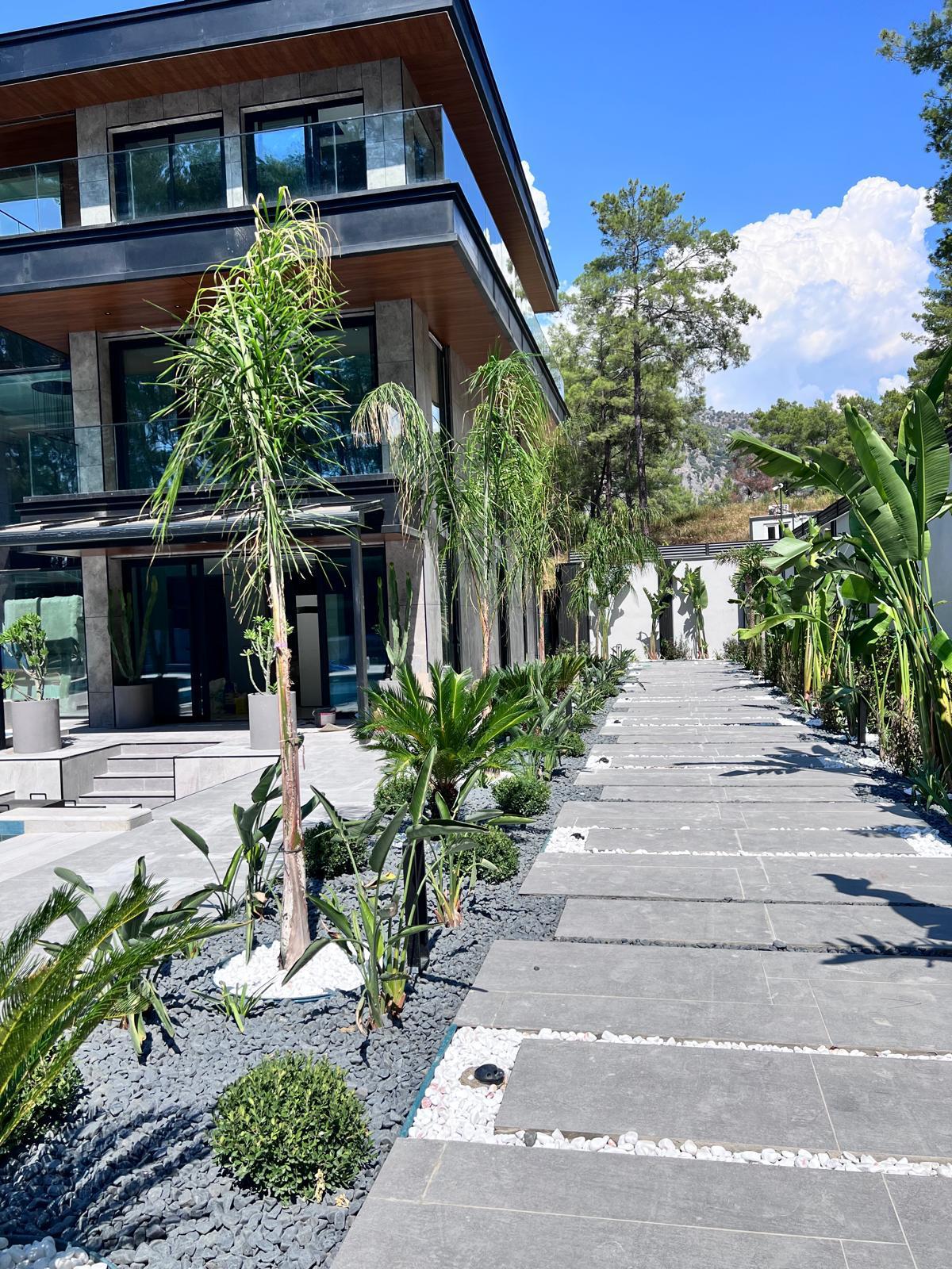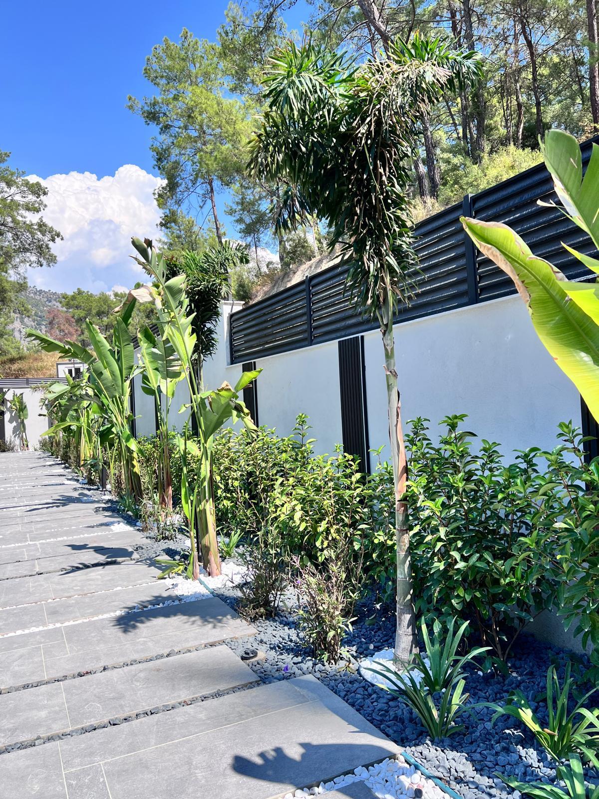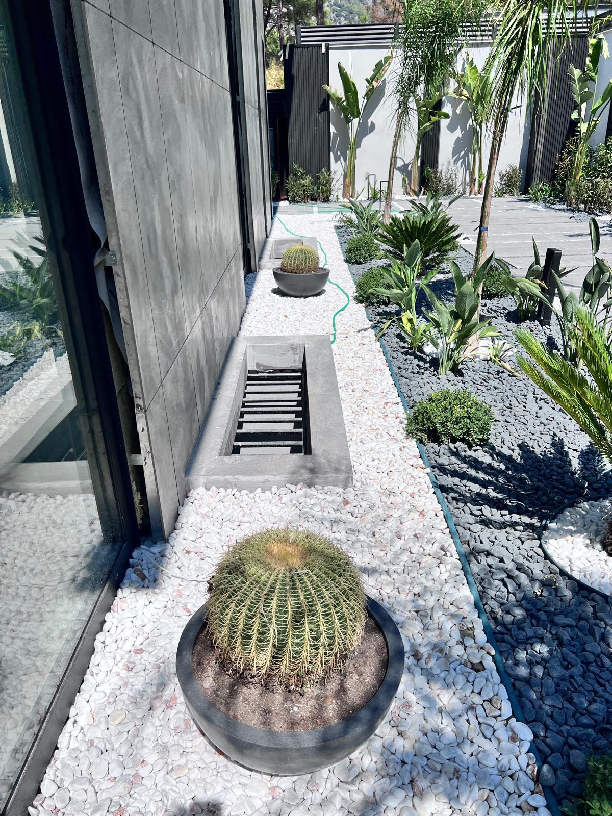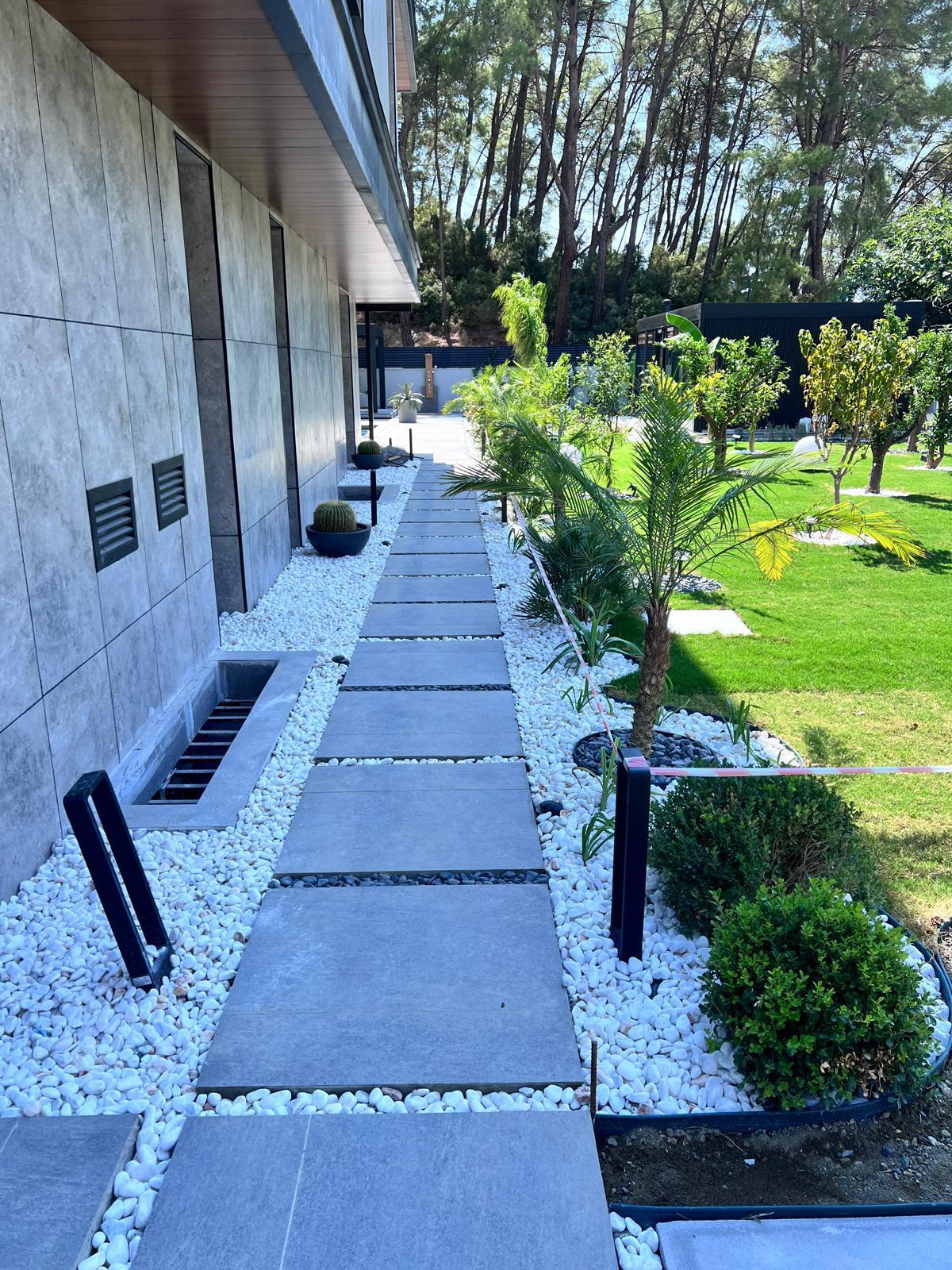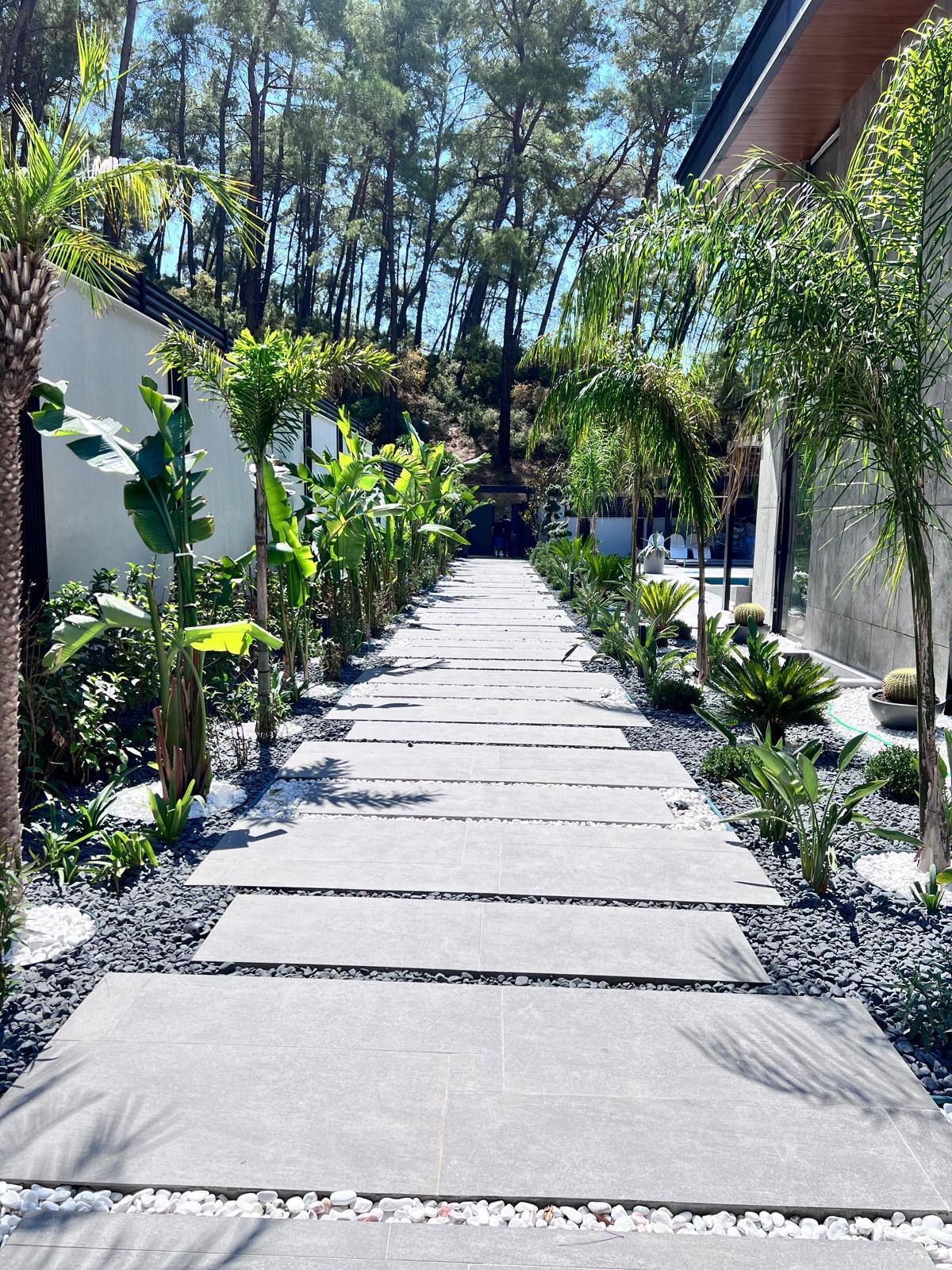 Göcek’in en güzel köşelerinden birinde yer alan bu villa, özenle hazırlanmış bir proje çizimi ile hayat bulmuş ve ardından uygulama aşamasına geçilmiştir. Tasarımda tropikal bitkiler ön planda tutulmuş; dev cennet kuşu çiçeği, ficus bonsai, zeytin bonsai, kraliçe palmiyesi, sicas, cüce hurma, tilki kuyruğu palmiyesi, altınfıçı kaktüsü ve kaya kaktüsü gibi zengin bir bitki çeşitliliği kullanılmıştır. Bahçenin bir kısmı görsel bir cennet olarak tasarlanırken, diğer bölümü meyve bahçesi olarak düzenlenmiştir. Havuz başındaki saksı bitkileri, bu alanı daha da zenginleştirmiştir. Meyve bahçesinin yanında, yemyeşil bir çim alan oluşturulmuş, pomza, bazalt ve dolamit taşları ile estetik bir düzenleme sağlanmıştır. En son olarak, rulo çim serimi ile hayal edilen bahçe tamamlanmış ve müşteriye teslim edilmiştir. Bu proje, doğayla iç içe huzurlu bir yaşam alanı sunmaktadır.