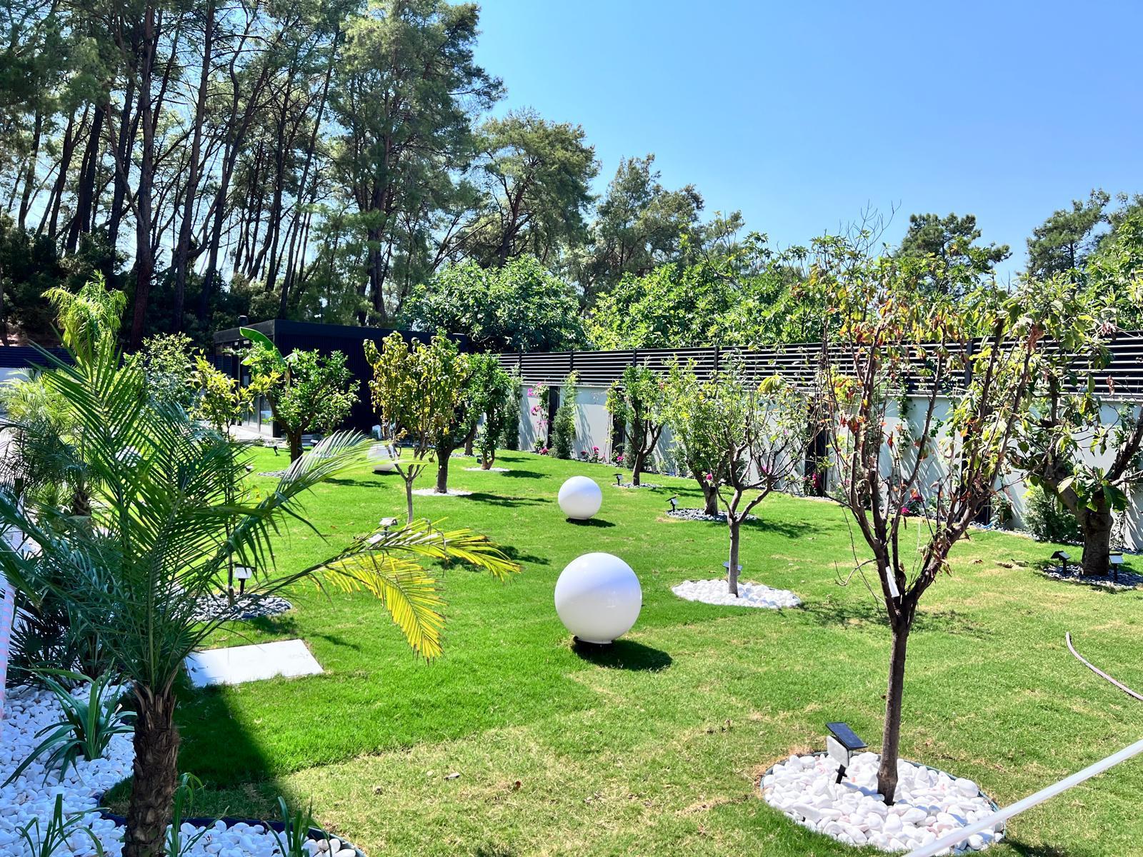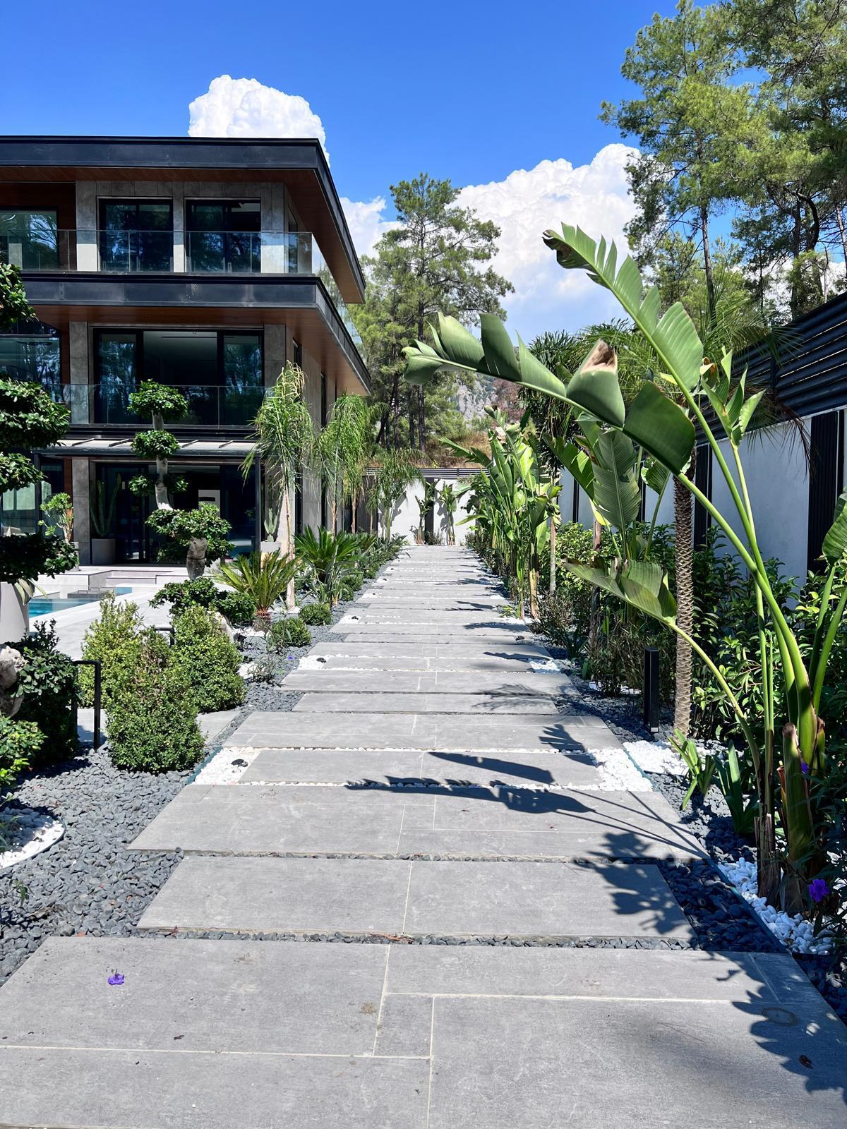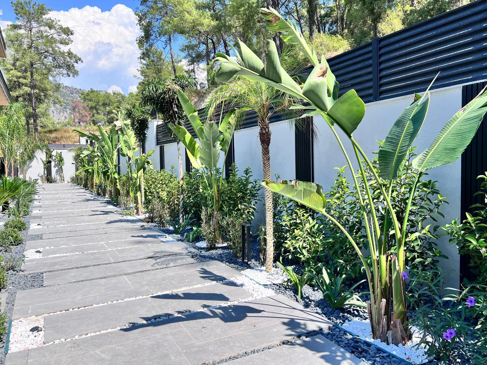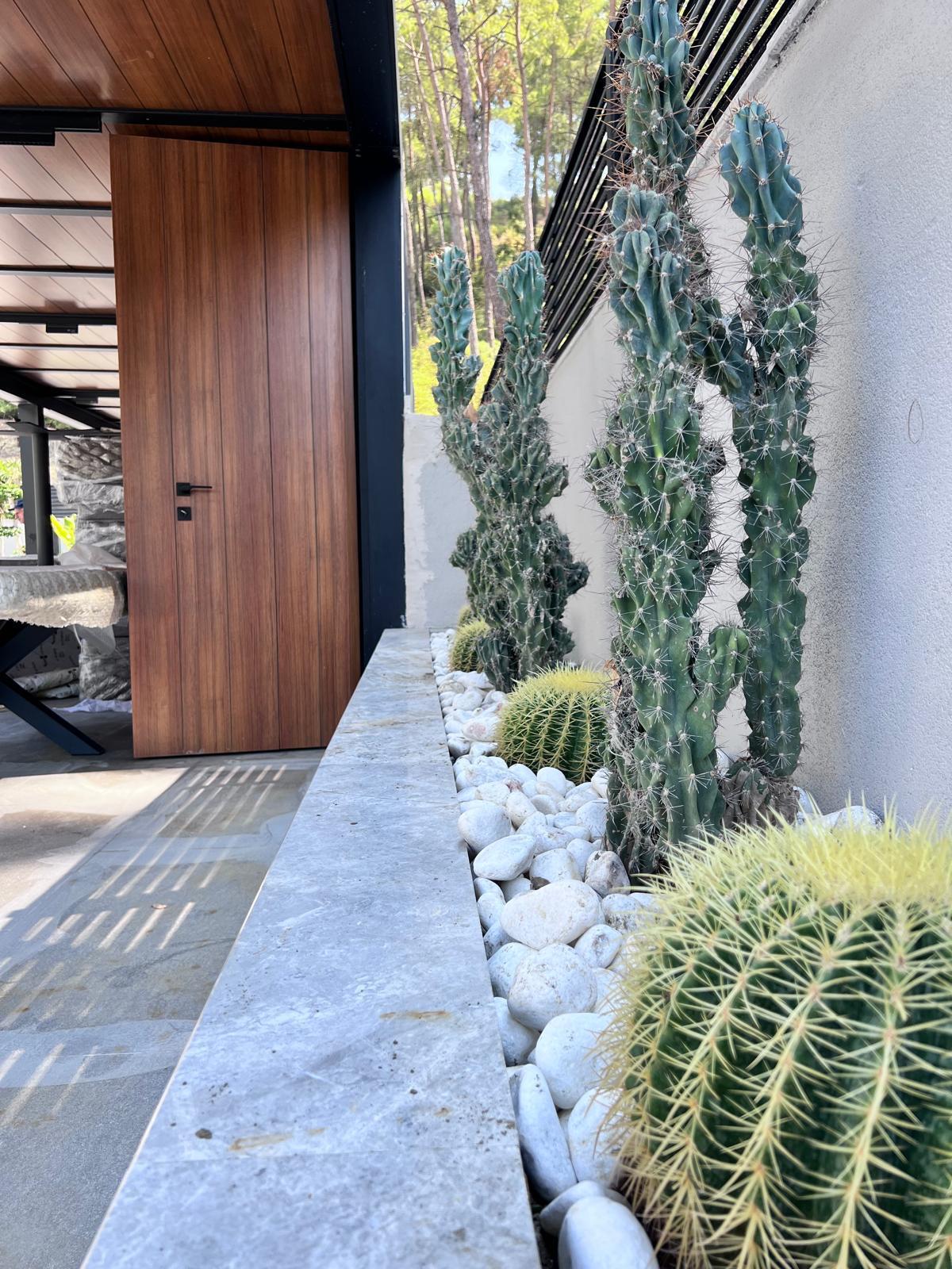 Göcek’in en güzel köşelerinden birinde yer alan bu villa, özenle hazırlanmış bir proje çizimi ile hayat bulmuş ve ardından uygulama aşamasına geçilmiştir. Tasarımda tropikal bitkiler ön planda tutulmuş; dev cennet kuşu çiçeği, ficus bonsai, zeytin bonsai, kraliçe palmiyesi, sicas, cüce hurma, tilki kuyruğu palmiyesi, altınfıçı kaktüsü ve kaya kaktüsü gibi zengin bir bitki çeşitliliği kullanılmıştır. Bahçenin bir kısmı görsel bir cennet olarak tasarlanırken, diğer bölümü meyve bahçesi olarak düzenlenmiştir. Havuz başındaki saksı bitkileri, bu alanı daha da zenginleştirmiştir. Meyve bahçesinin yanında, yemyeşil bir çim alan oluşturulmuş, pomza, bazalt ve dolamit taşları ile estetik bir düzenleme sağlanmıştır. En son olarak, rulo çim serimi ile hayal edilen bahçe tamamlanmış ve müşteriye teslim edilmiştir. Bu proje, doğayla iç içe huzurlu bir yaşam alanı sunmaktadır.