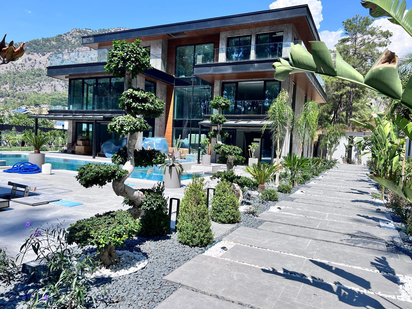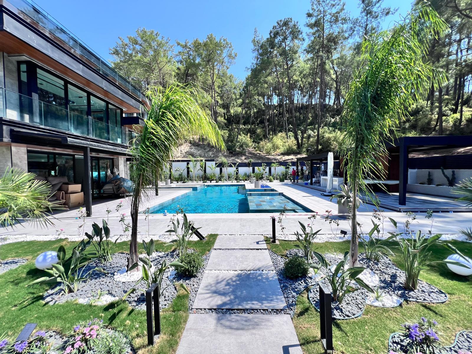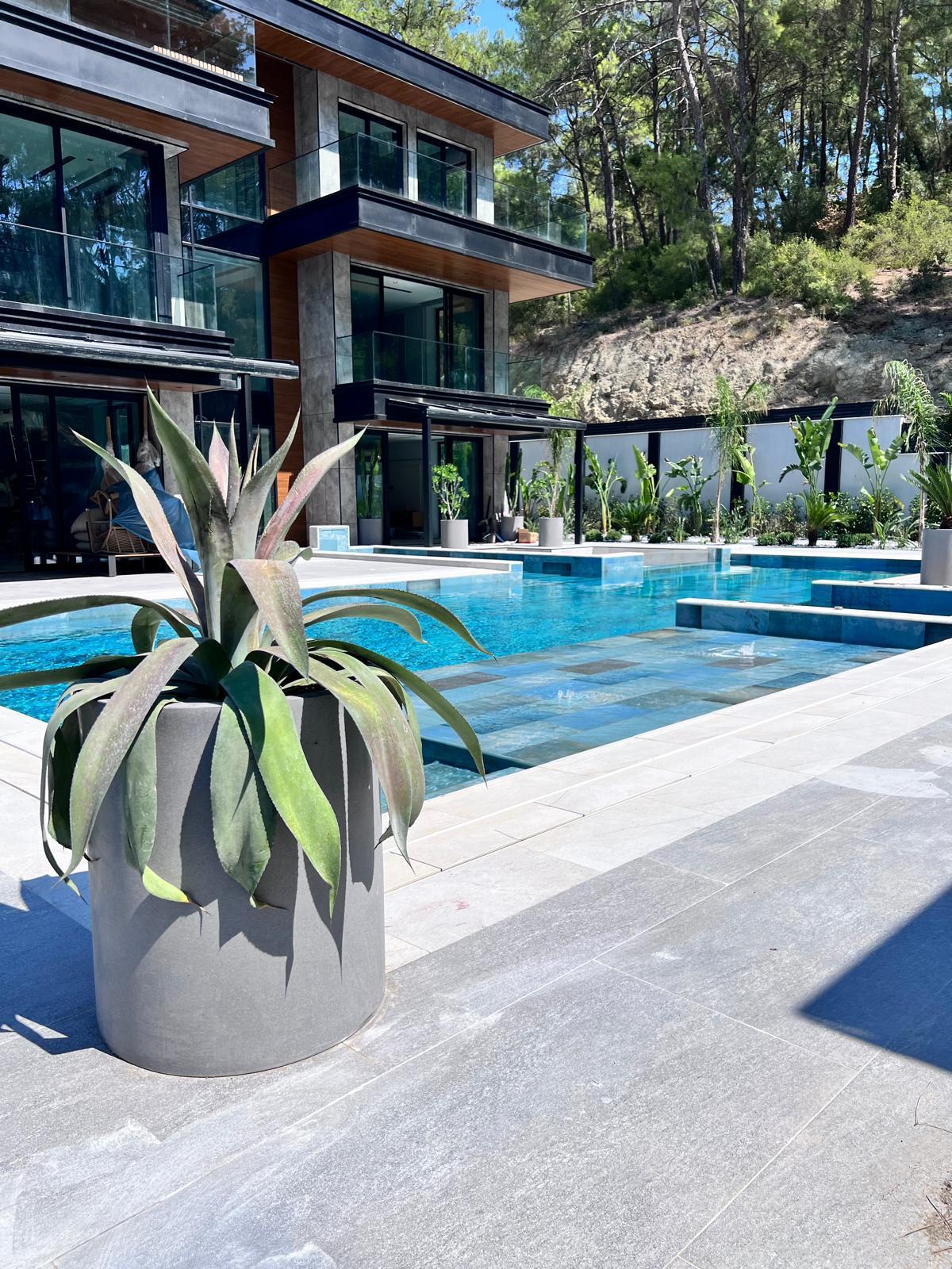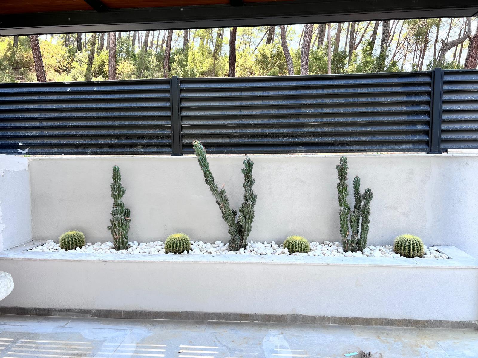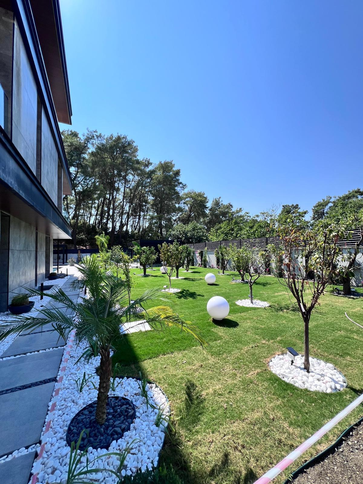 Göcek’in en güzel köşelerinden birinde yer alan bu villa, özenle hazırlanmış bir proje çizimi ile hayat bulmuş ve ardından uygulama aşamasına geçilmiştir. Tasarımda tropikal bitkiler ön planda tutulmuş; dev cennet kuşu çiçeği, ficus bonsai, zeytin bonsai, kraliçe palmiyesi, sicas, cüce hurma, tilki kuyruğu palmiyesi, altınfıçı kaktüsü ve kaya kaktüsü gibi zengin bir bitki çeşitliliği kullanılmıştır. Bahçenin bir kısmı görsel bir cennet olarak tasarlanırken, diğer bölümü meyve bahçesi olarak düzenlenmiştir. Havuz başındaki saksı bitkileri, bu alanı daha da zenginleştirmiştir. Meyve bahçesinin yanında, yemyeşil bir çim alan oluşturulmuş, pomza, bazalt ve dolamit taşları ile estetik bir düzenleme sağlanmıştır. En son olarak, rulo çim serimi ile hayal edilen bahçe tamamlanmış ve müşteriye teslim edilmiştir. Bu proje, doğayla iç içe huzurlu bir yaşam alanı sunmaktadır.
