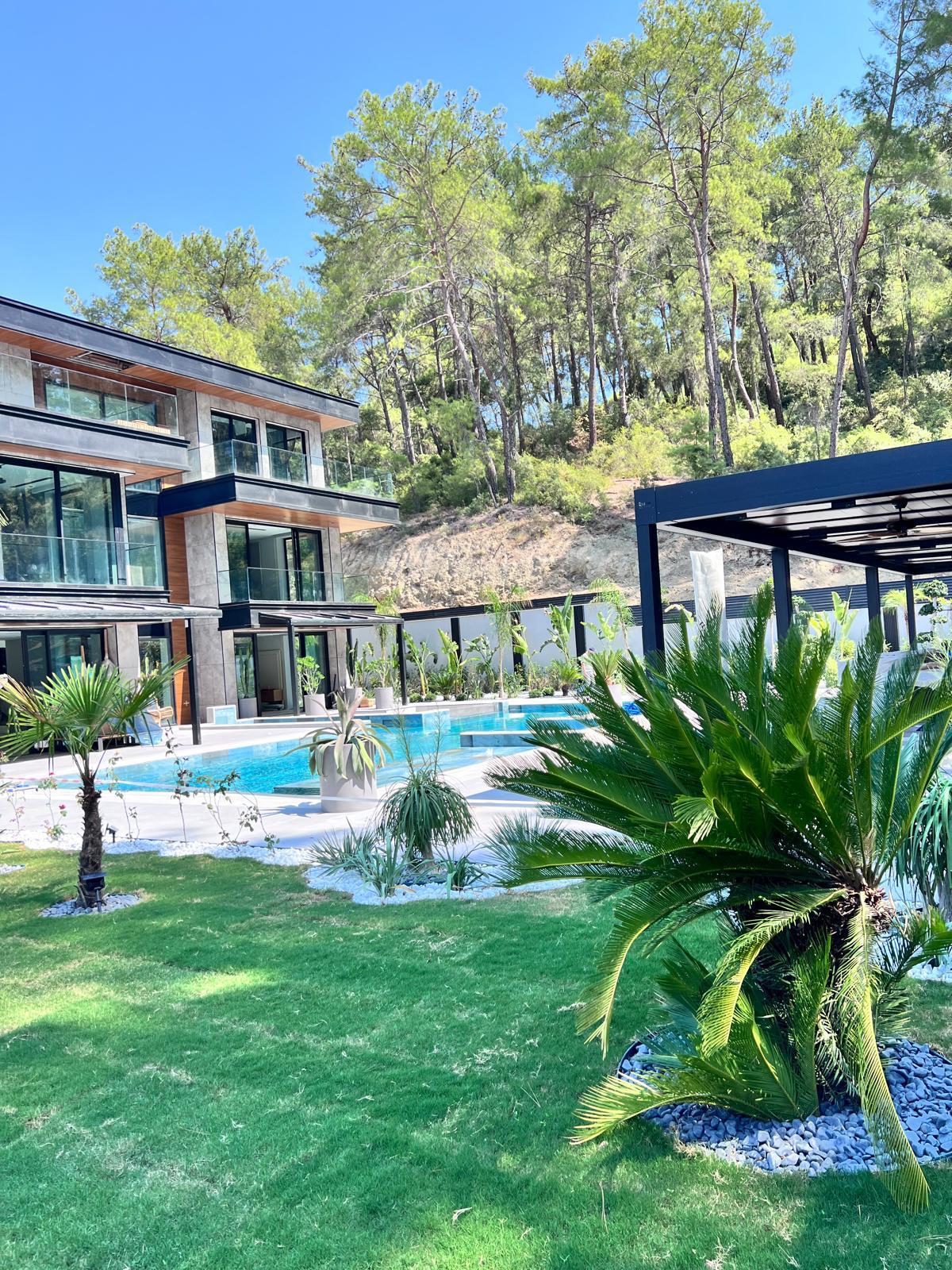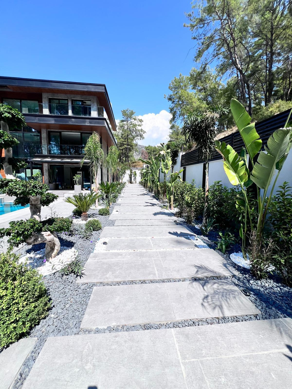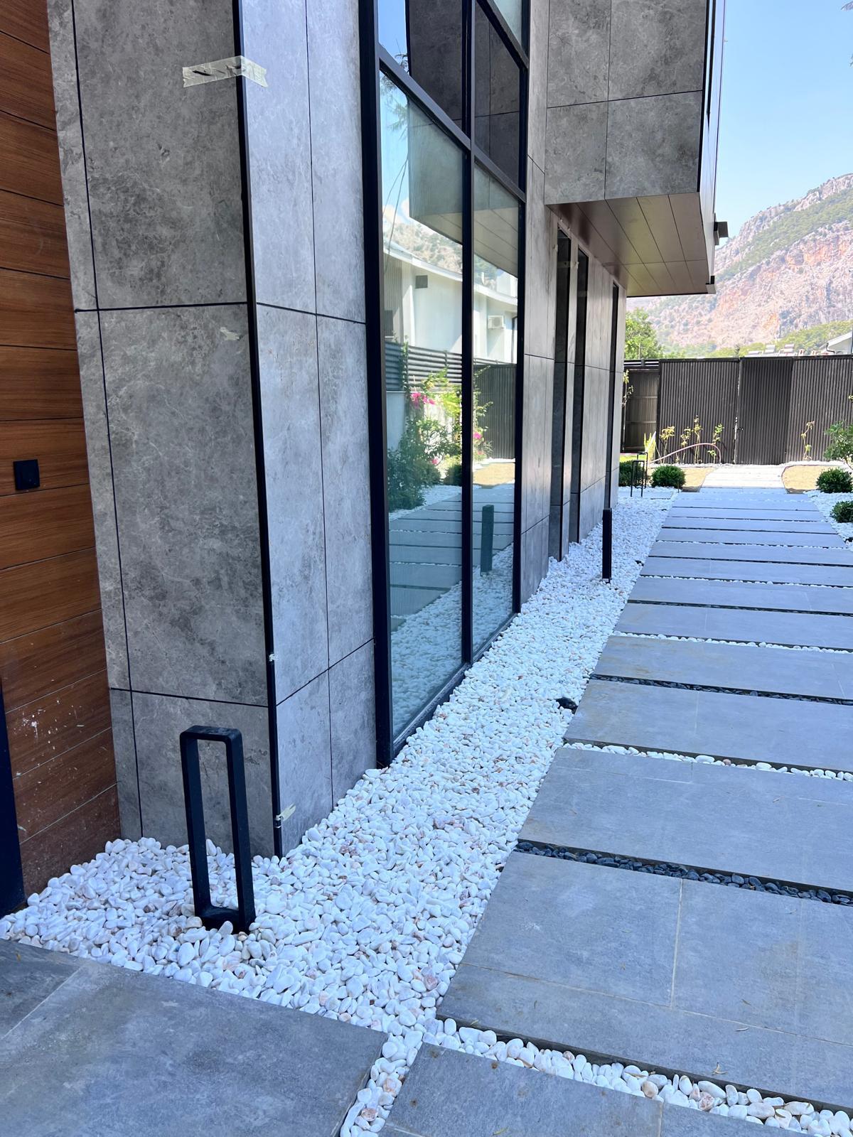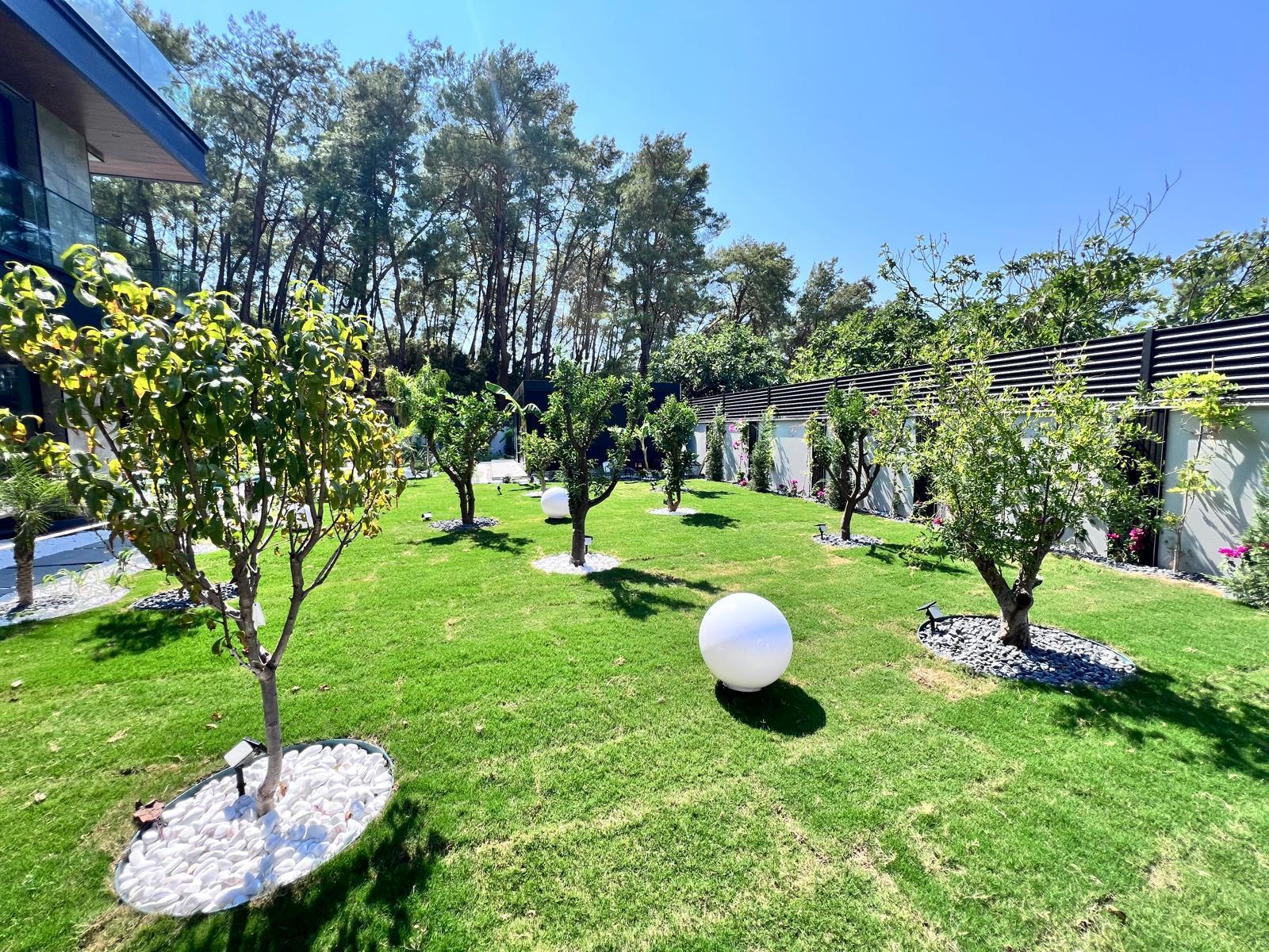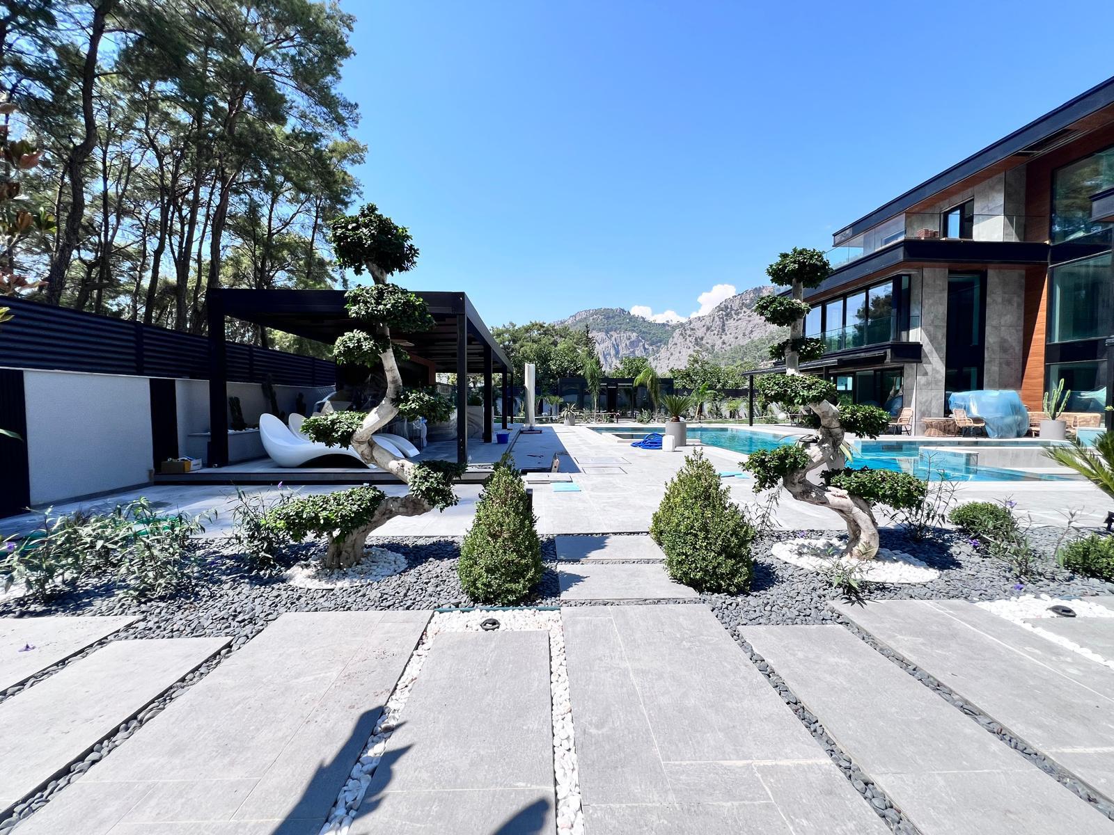 Göcek’in en güzel köşelerinden birinde yer alan bu villa, özenle hazırlanmış bir proje çizimi ile hayat bulmuş ve ardından uygulama aşamasına geçilmiştir. Tasarımda tropikal bitkiler ön planda tutulmuş; dev cennet kuşu çiçeği, ficus bonsai, zeytin bonsai, kraliçe palmiyesi, sicas, cüce hurma, tilki kuyruğu palmiyesi, altınfıçı kaktüsü ve kaya kaktüsü gibi zengin bir bitki çeşitliliği kullanılmıştır. Bahçenin bir kısmı görsel bir cennet olarak tasarlanırken, diğer bölümü meyve bahçesi olarak düzenlenmiştir. Havuz başındaki saksı bitkileri, bu alanı daha da zenginleştirmiştir. Meyve bahçesinin yanında, yemyeşil bir çim alan oluşturulmuş, pomza, bazalt ve dolamit taşları ile estetik bir düzenleme sağlanmıştır. En son olarak, rulo çim serimi ile hayal edilen bahçe tamamlanmış ve müşteriye teslim edilmiştir. Bu proje, doğayla iç içe huzurlu bir yaşam alanı sunmaktadır.